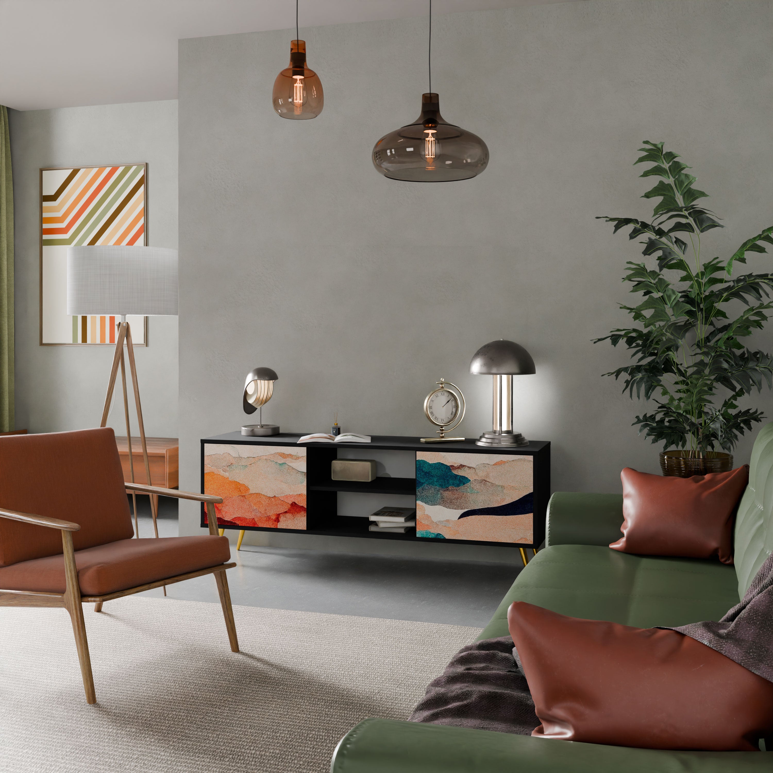 Czarny korpus nadaje szafce eleganckiego, nowoczesnego wyglądu, a fronty z wyjątkowym nadrukiem przyciągają uwagę, czyniąc ją centralnym punktem każdego pomieszczenia. Przestronne wnętrze pomieści sprzęt elektroniczny, kable, piloty i inne akcesoria, pozwalając utrzymać porządek.