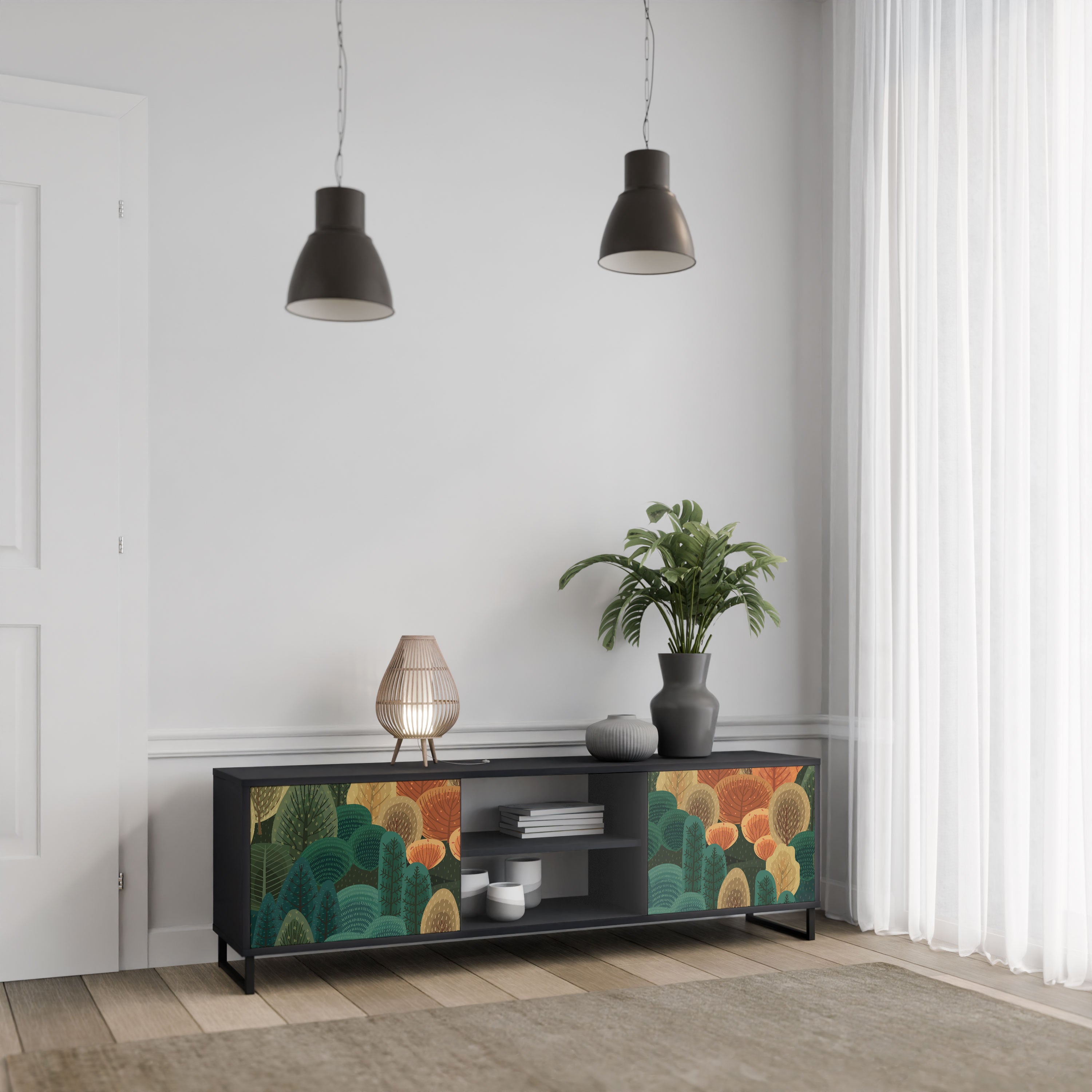 Czarny korpus nadaje szafce eleganckiego, nowoczesnego wyglądu, a fronty z wyjątkowym nadrukiem przyciągają uwagę, czyniąc ją centralnym punktem każdego pomieszczenia. Przestronne wnętrze pomieści sprzęt elektroniczny, kable, piloty i inne akcesoria, pozwalając utrzymać porządek.
