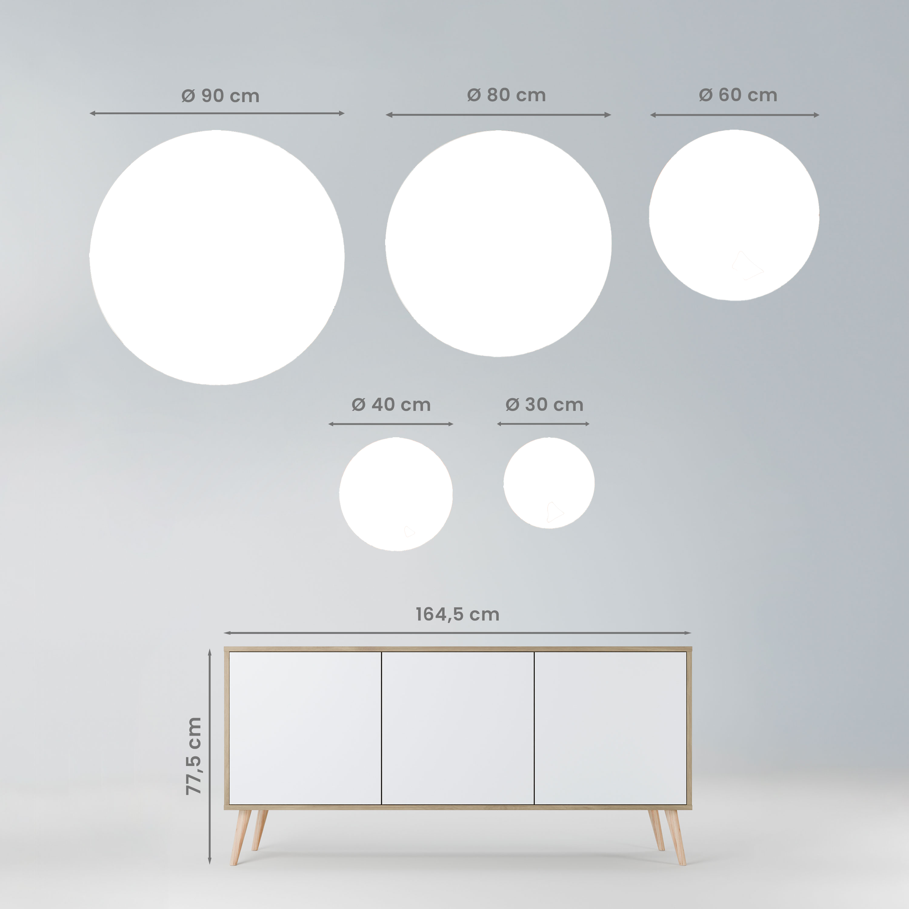 Okrągłe naklejki dostępne są w kilku rozmiarach, co pozwala swobodnie dopasować je do wielkości ściany i planowanej aranżacji. Mniejsze formaty świetnie sprawdzają się w formie zestawu lub delikatnego akcentu, natomiast większe tworzą wyrazistą, przyciągającą wzrok dekorację.