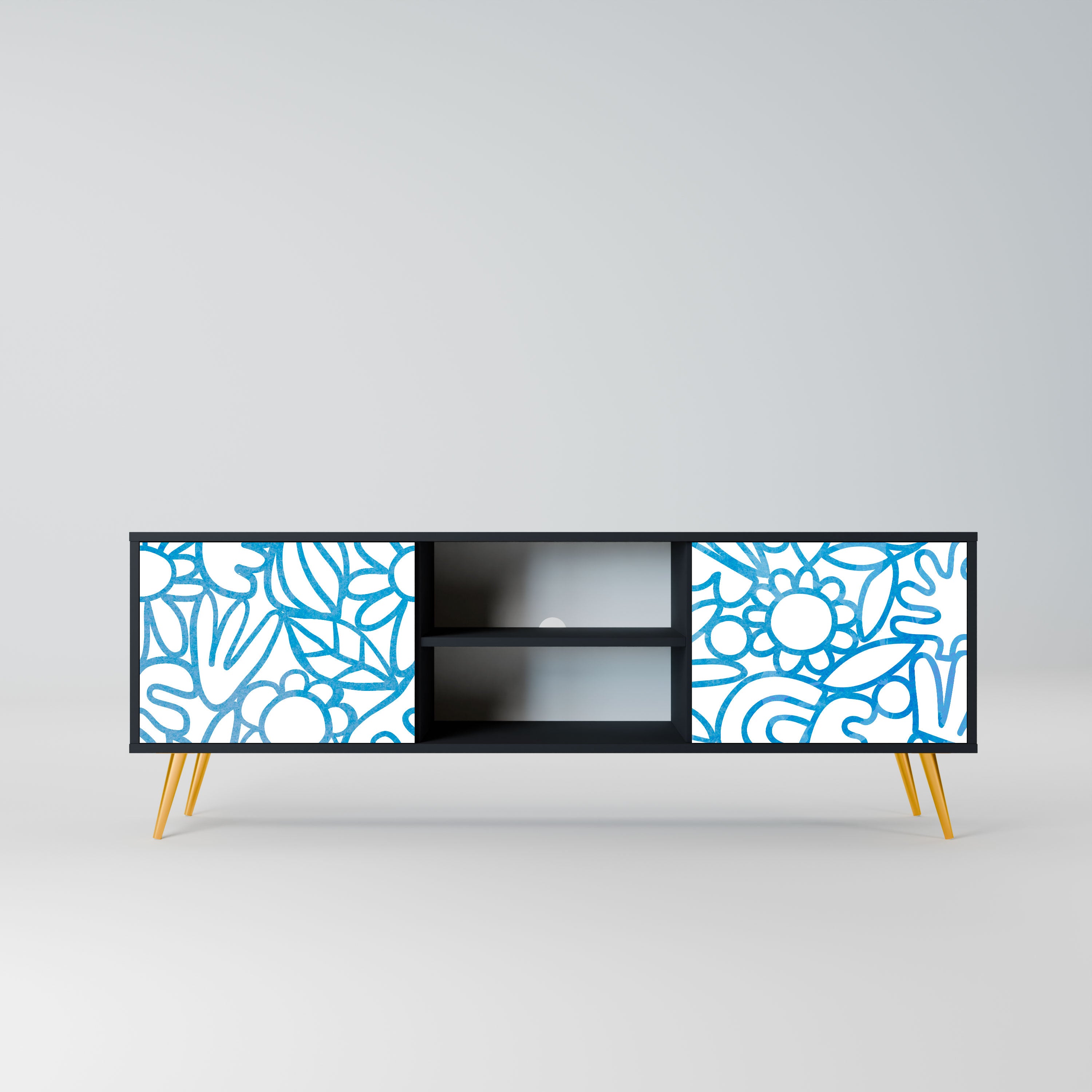 Czarny korpus nadaje szafce eleganckiego, nowoczesnego wyglądu, a fronty z wyjątkowym nadrukiem przyciągają uwagę, czyniąc ją centralnym punktem każdego pomieszczenia. Przestronne wnętrze pomieści sprzęt elektroniczny, kable, piloty i inne akcesoria, pozwalając utrzymać porządek.