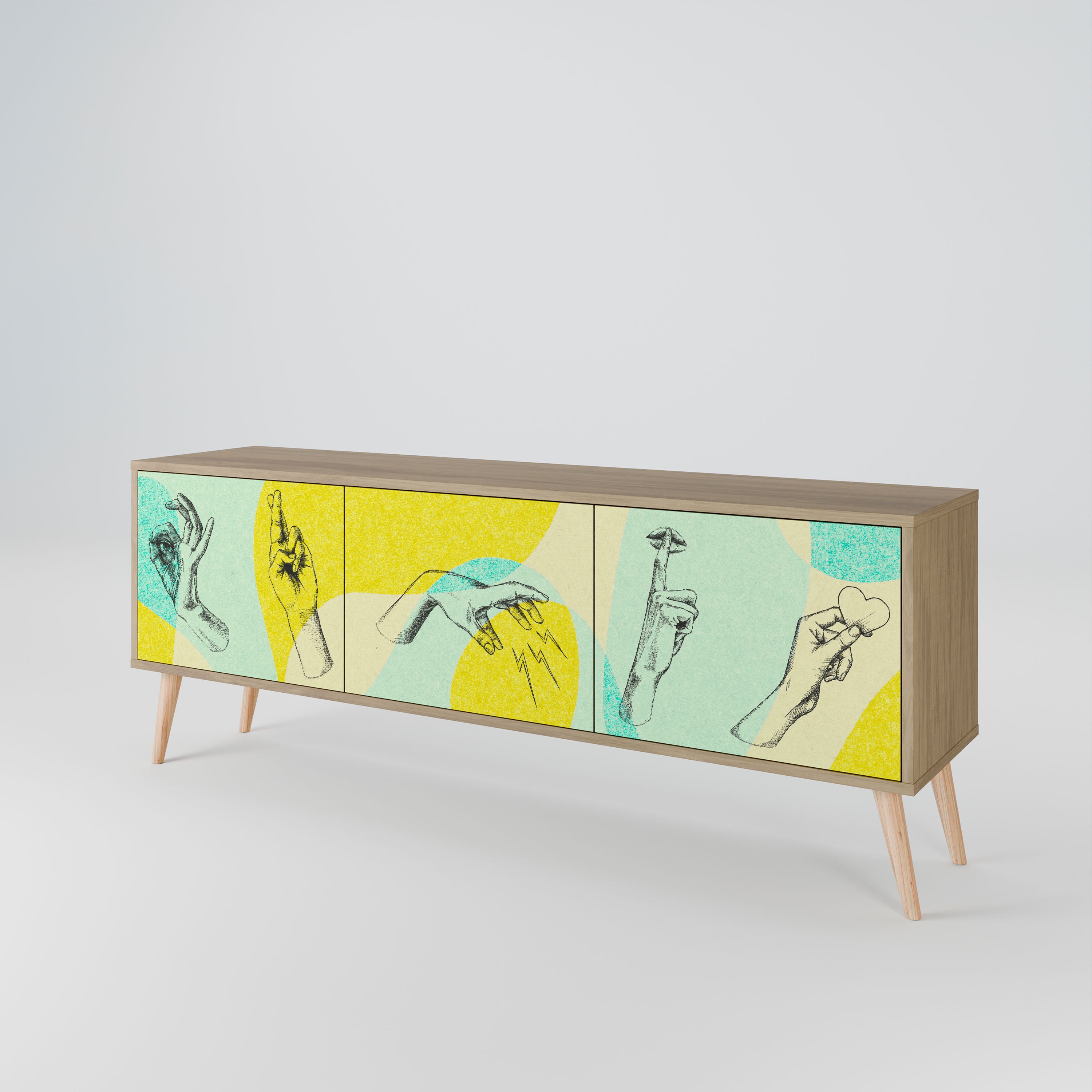 Odkryj idealne rozwiązanie do przechowywania i organizacji przestrzeni z naszą 3-drzwiową szafką pod telewizor. Wykonana z trwałych materiałów, łącząc drewniane nóżki z laminowanym korpusem, ta szafka jest zarówno stylowa, jak i funkcjonalna. Drewniane drzwiczki z atrakcyjnym nadrukiem dodają elegancji, czyniąc ją doskonałym wyborem dla każdego wnętrza.