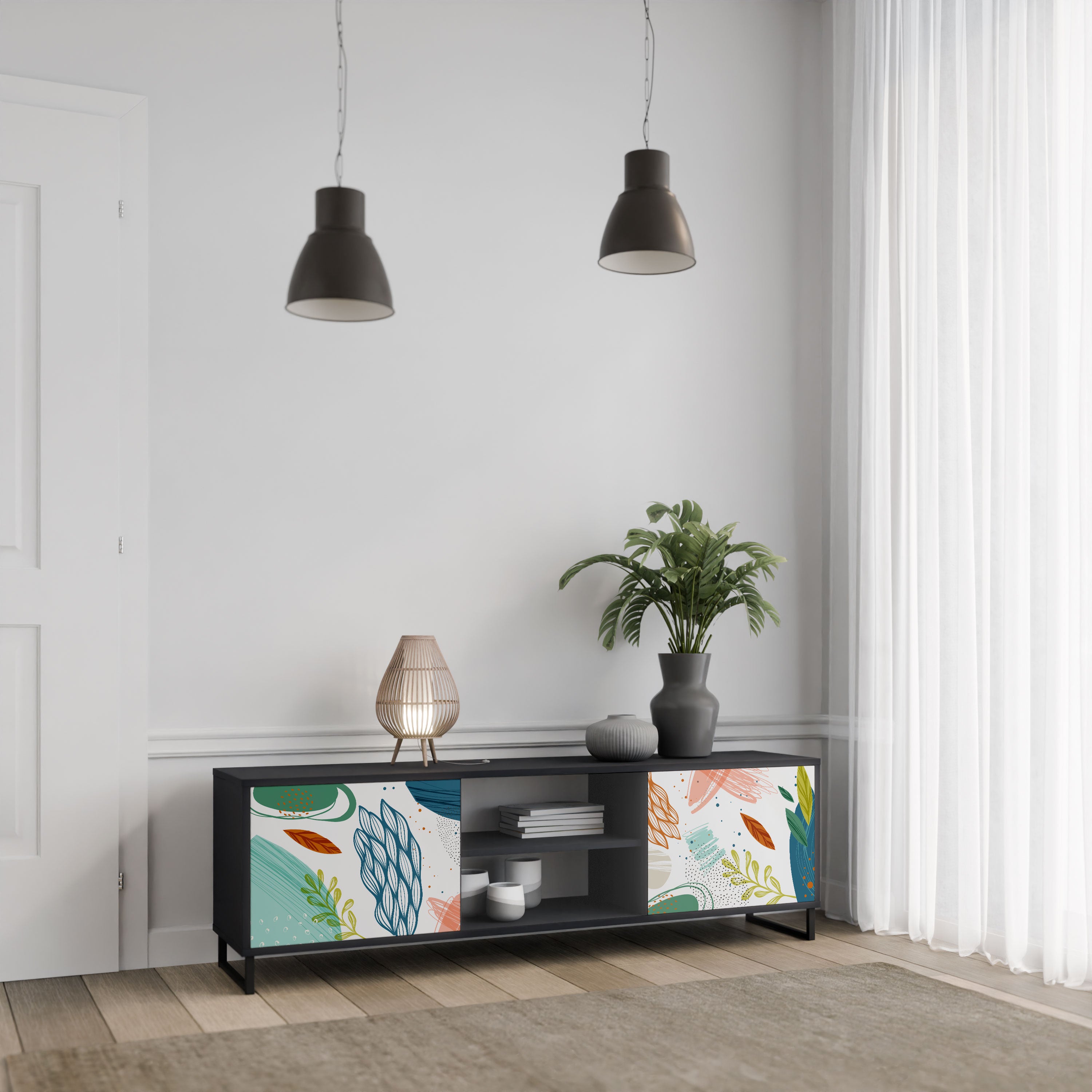 Czarny korpus nadaje szafce eleganckiego, nowoczesnego wyglądu, a fronty z wyjątkowym nadrukiem przyciągają uwagę, czyniąc ją centralnym punktem każdego pomieszczenia. Przestronne wnętrze pomieści sprzęt elektroniczny, kable, piloty i inne akcesoria, pozwalając utrzymać porządek.