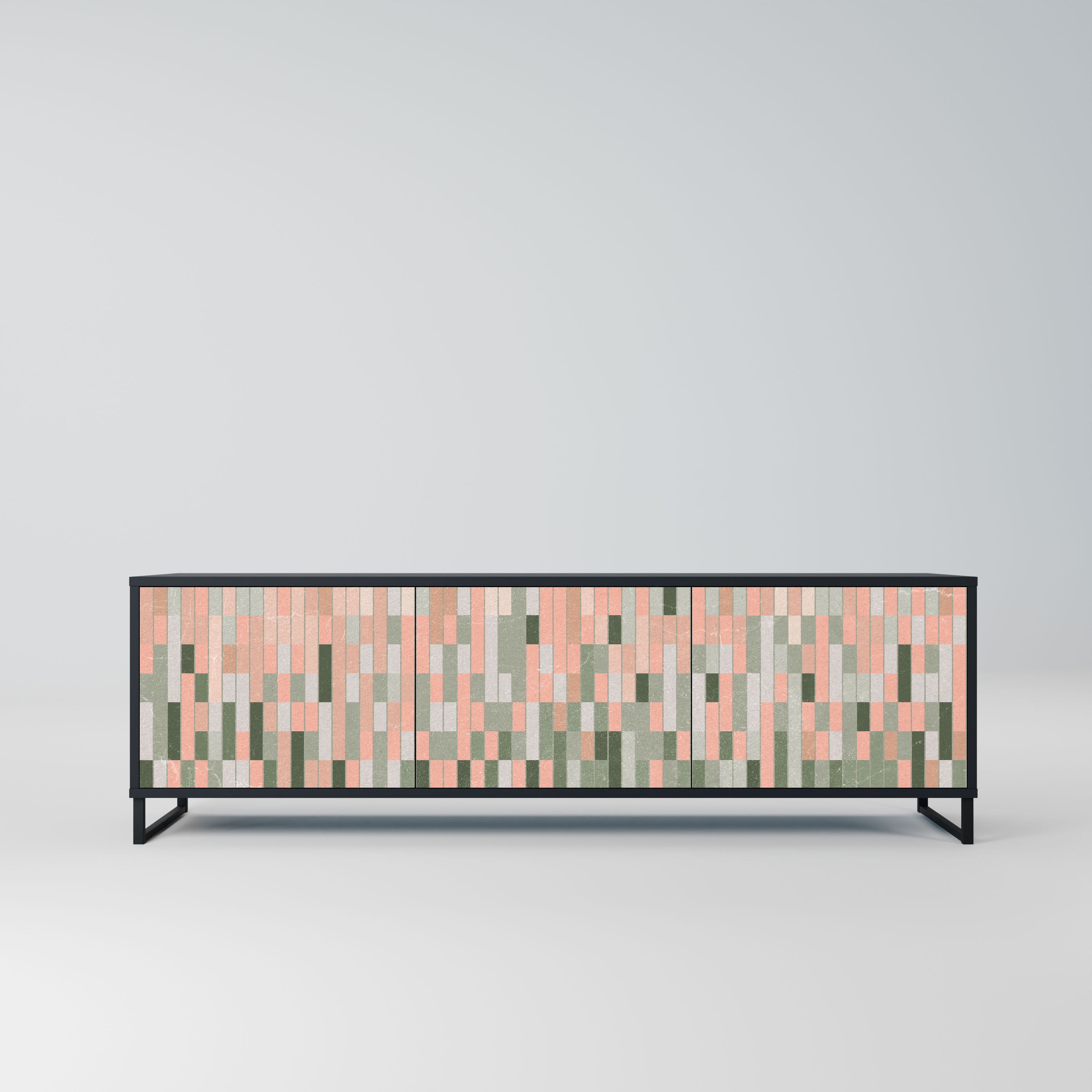 Czarny korpus szafki tworzy wyrazisty, nowoczesny akcent, który świetnie komponuje się z industrialnymi i minimalistycznymi aranżacjami. Fronty z designerskim nadrukiem dodają charakteru i niepowtarzalności, czyniąc mebel nie tylko praktycznym, ale także wyjątkowym elementem dekoracyjnym.