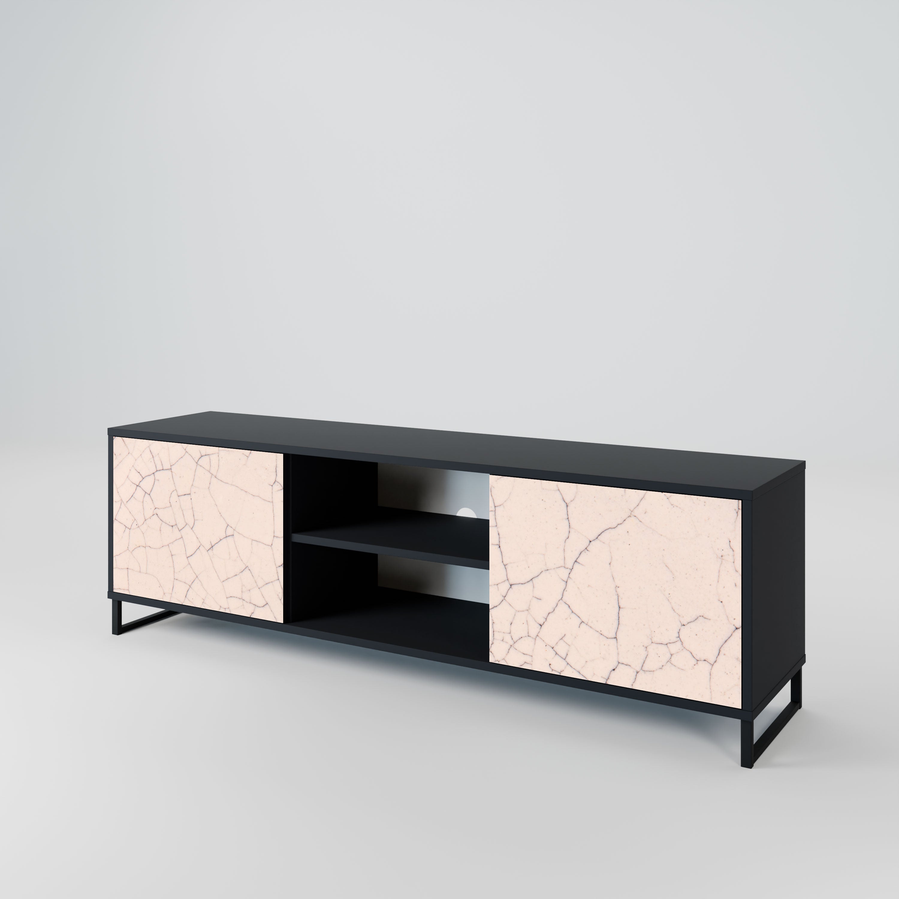 Czarny korpus nadaje szafce eleganckiego, nowoczesnego wyglądu, a fronty z wyjątkowym nadrukiem przyciągają uwagę, czyniąc ją centralnym punktem każdego pomieszczenia. Przestronne wnętrze pomieści sprzęt elektroniczny, kable, piloty i inne akcesoria, pozwalając utrzymać porządek.