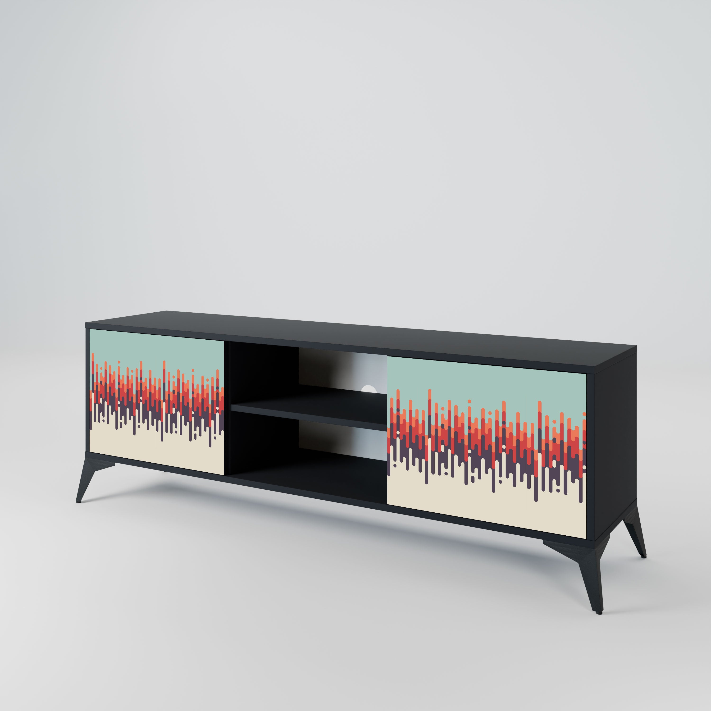 Czarny korpus nadaje szafce eleganckiego, nowoczesnego wyglądu, a fronty z wyjątkowym nadrukiem przyciągają uwagę, czyniąc ją centralnym punktem każdego pomieszczenia. Przestronne wnętrze pomieści sprzęt elektroniczny, kable, piloty i inne akcesoria, pozwalając utrzymać porządek.