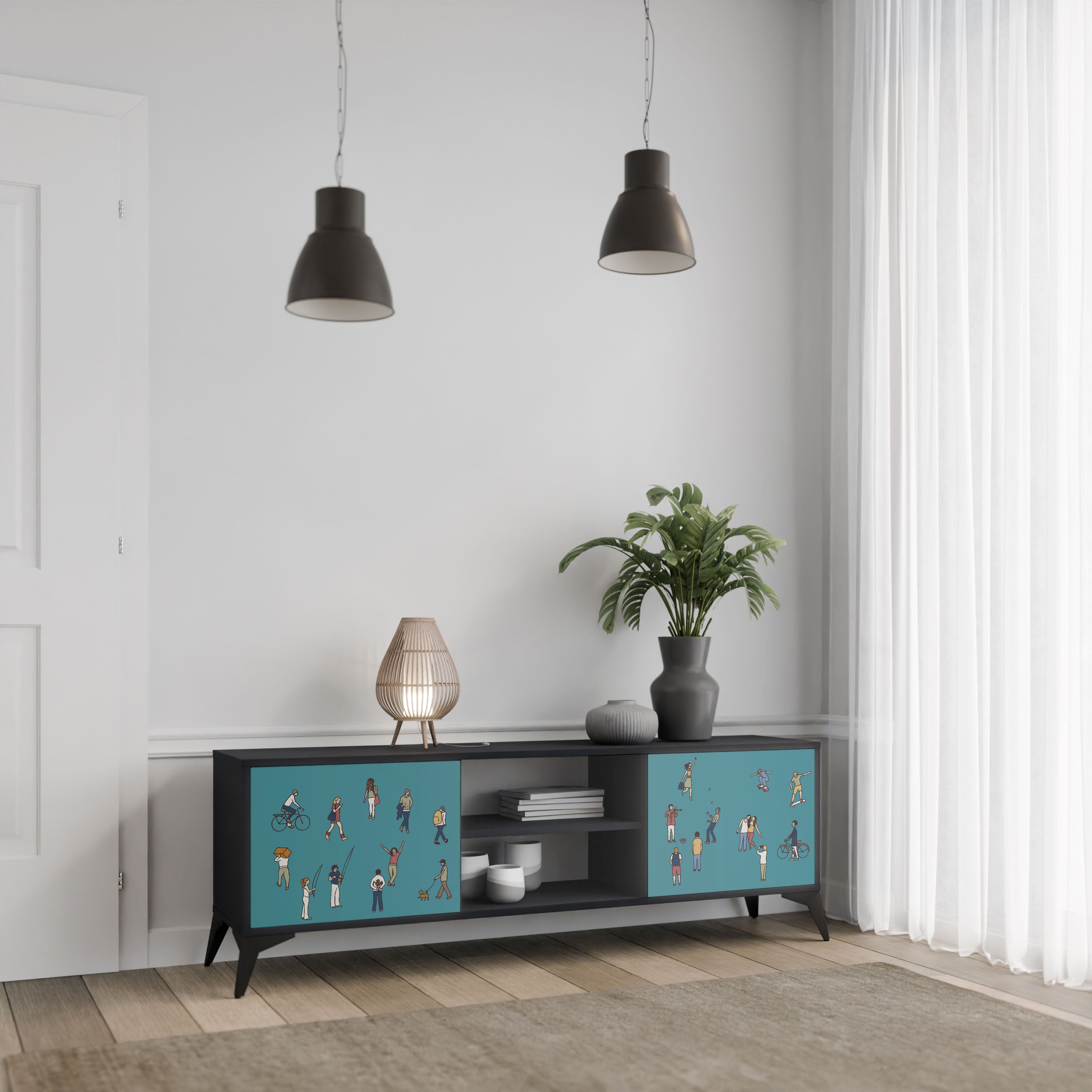 Czarny korpus nadaje szafce eleganckiego, nowoczesnego wyglądu, a fronty z wyjątkowym nadrukiem przyciągają uwagę, czyniąc ją centralnym punktem każdego pomieszczenia. Przestronne wnętrze pomieści sprzęt elektroniczny, kable, piloty i inne akcesoria, pozwalając utrzymać porządek.