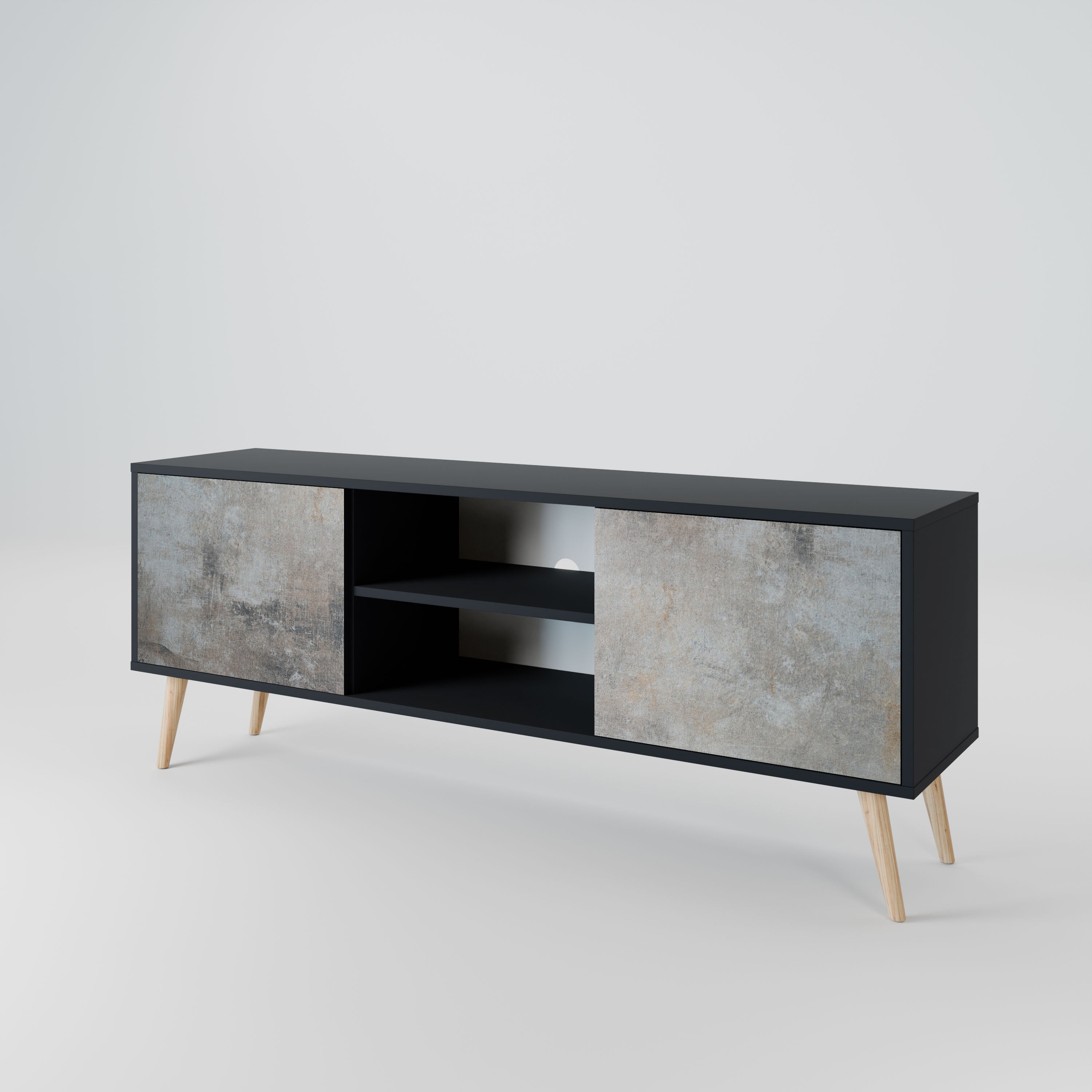 Czarny korpus nadaje szafce eleganckiego, nowoczesnego wyglądu, a fronty z wyjątkowym nadrukiem przyciągają uwagę, czyniąc ją centralnym punktem każdego pomieszczenia. Przestronne wnętrze pomieści sprzęt elektroniczny, kable, piloty i inne akcesoria, pozwalając utrzymać porządek.