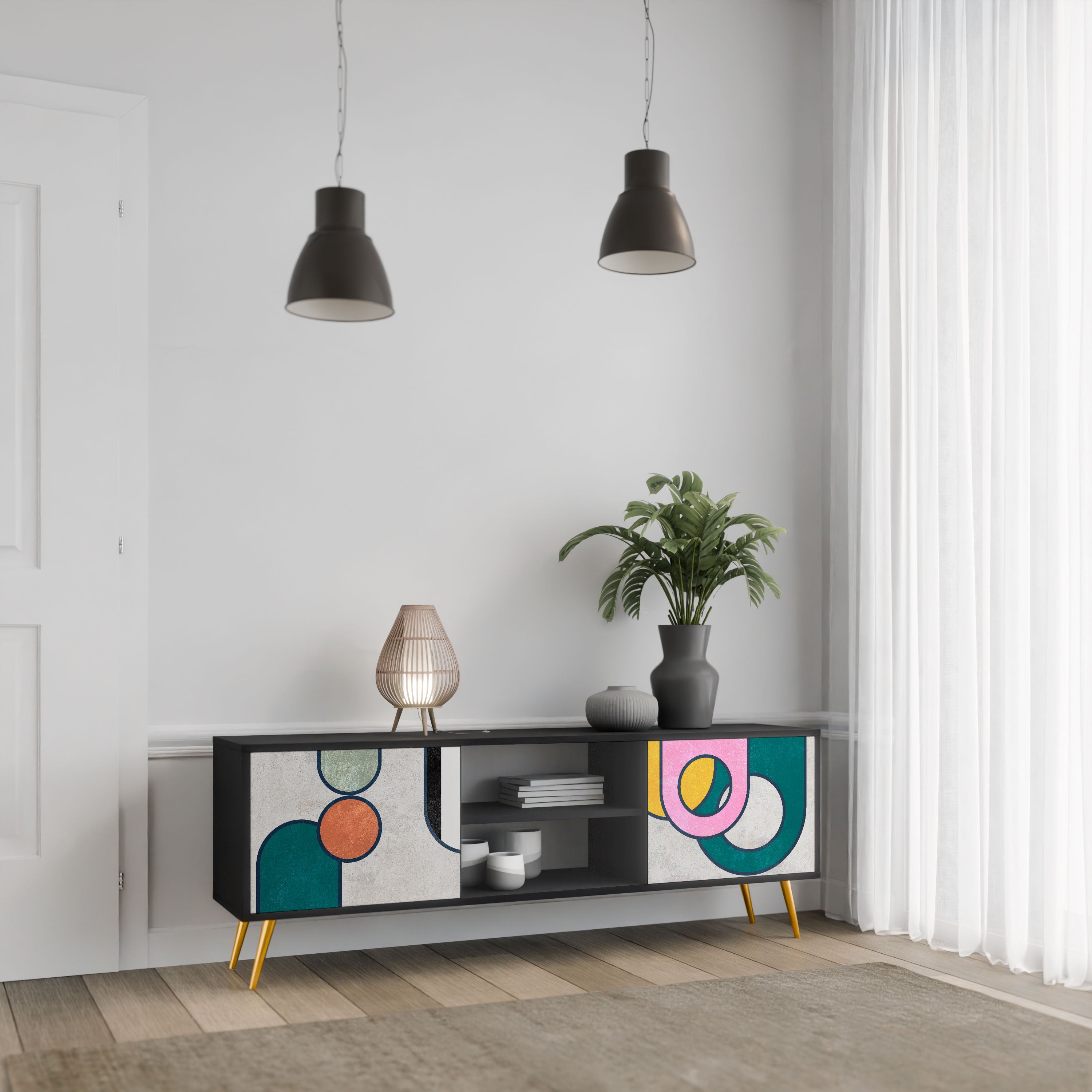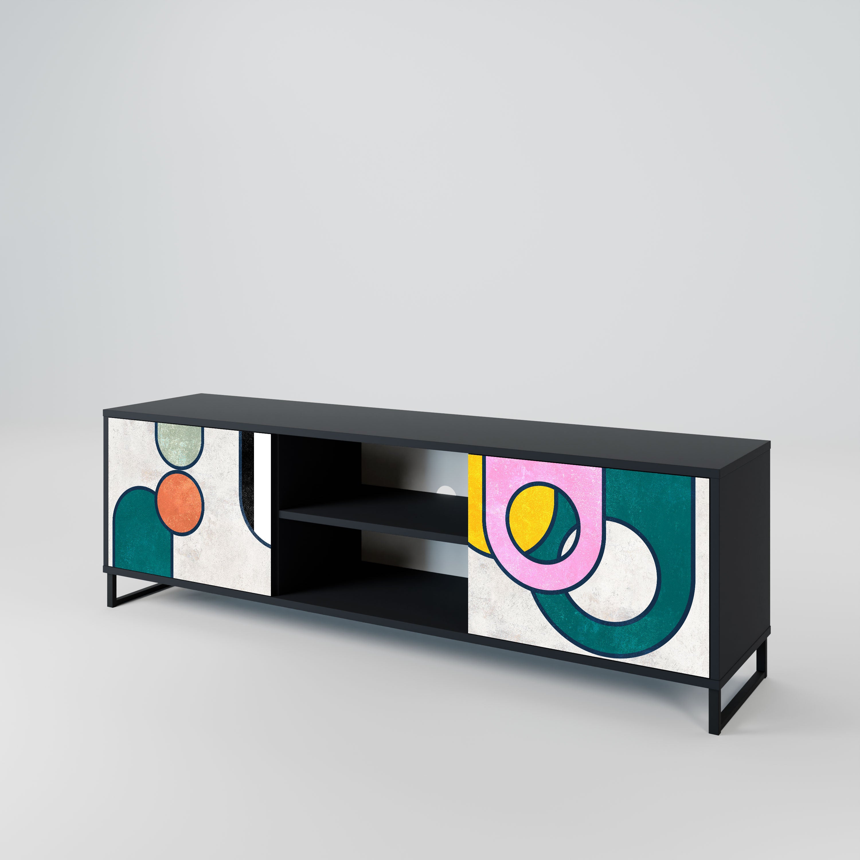 Czarny korpus nadaje szafce eleganckiego, nowoczesnego wyglądu, a fronty z wyjątkowym nadrukiem przyciągają uwagę, czyniąc ją centralnym punktem każdego pomieszczenia. Przestronne wnętrze pomieści sprzęt elektroniczny, kable, piloty i inne akcesoria, pozwalając utrzymać porządek.