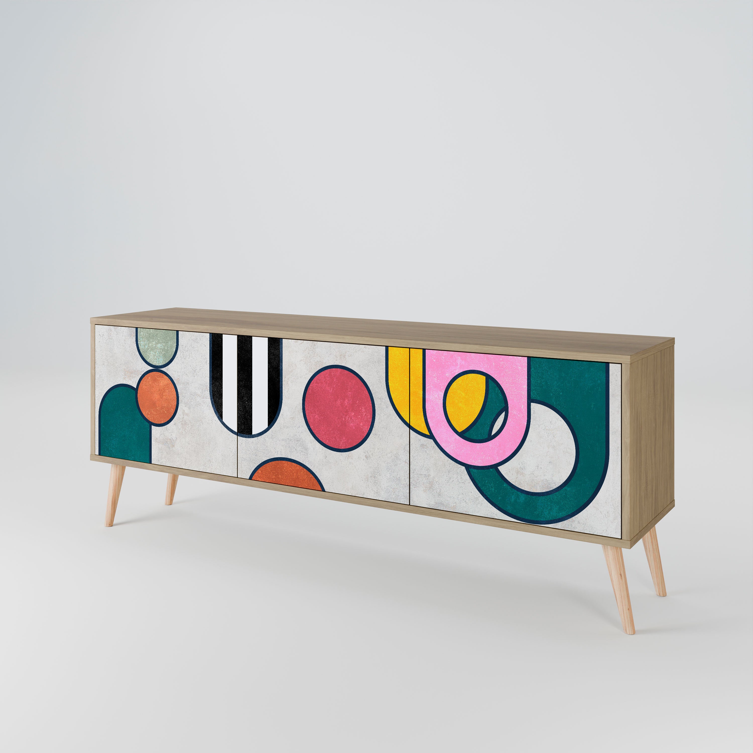 Odkryj idealne rozwiązanie do przechowywania i organizacji przestrzeni z naszą 3-drzwiową szafką pod telewizor. Wykonana z trwałych materiałów, łącząc drewniane nóżki z laminowanym korpusem, ta szafka jest zarówno stylowa, jak i funkcjonalna. Drewniane drzwiczki z atrakcyjnym nadrukiem dodają elegancji, czyniąc ją doskonałym wyborem dla każdego wnętrza.