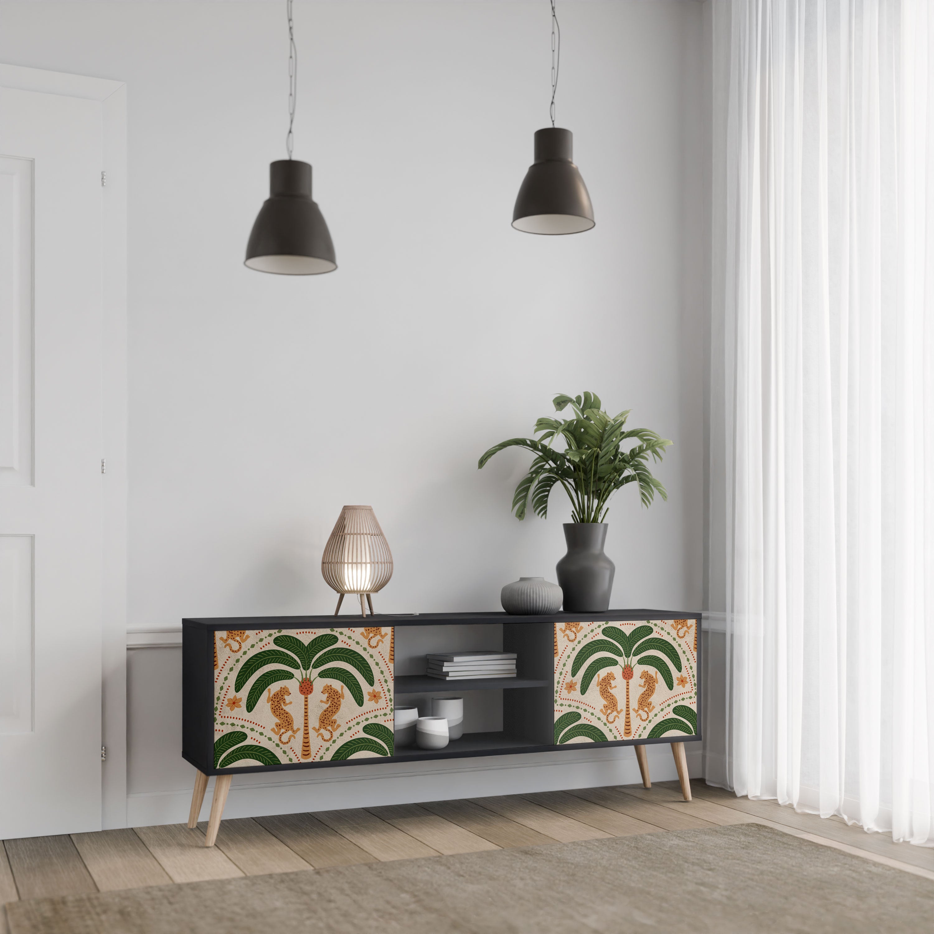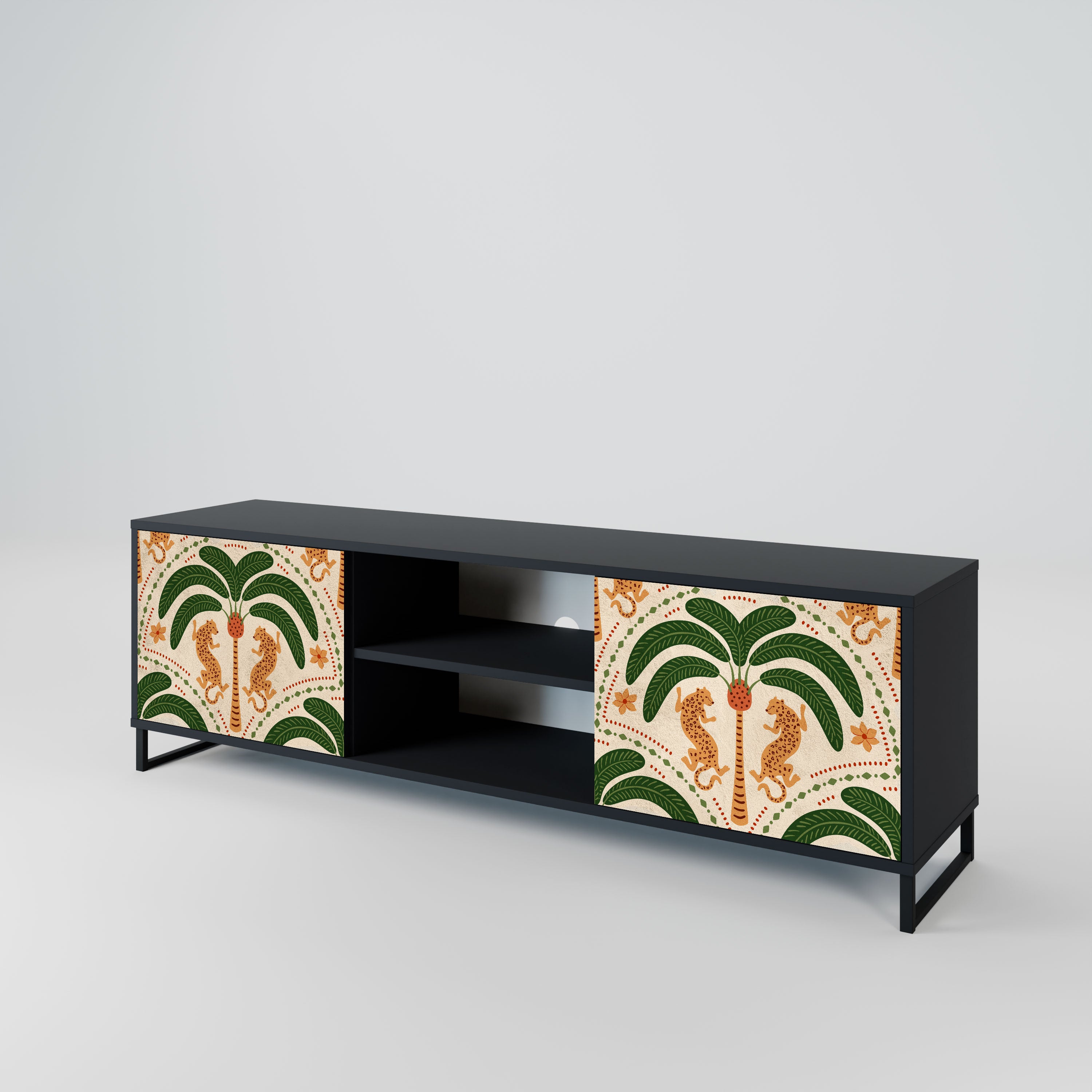 Czarny korpus nadaje szafce eleganckiego, nowoczesnego wyglądu, a fronty z wyjątkowym nadrukiem przyciągają uwagę, czyniąc ją centralnym punktem każdego pomieszczenia. Przestronne wnętrze pomieści sprzęt elektroniczny, kable, piloty i inne akcesoria, pozwalając utrzymać porządek.