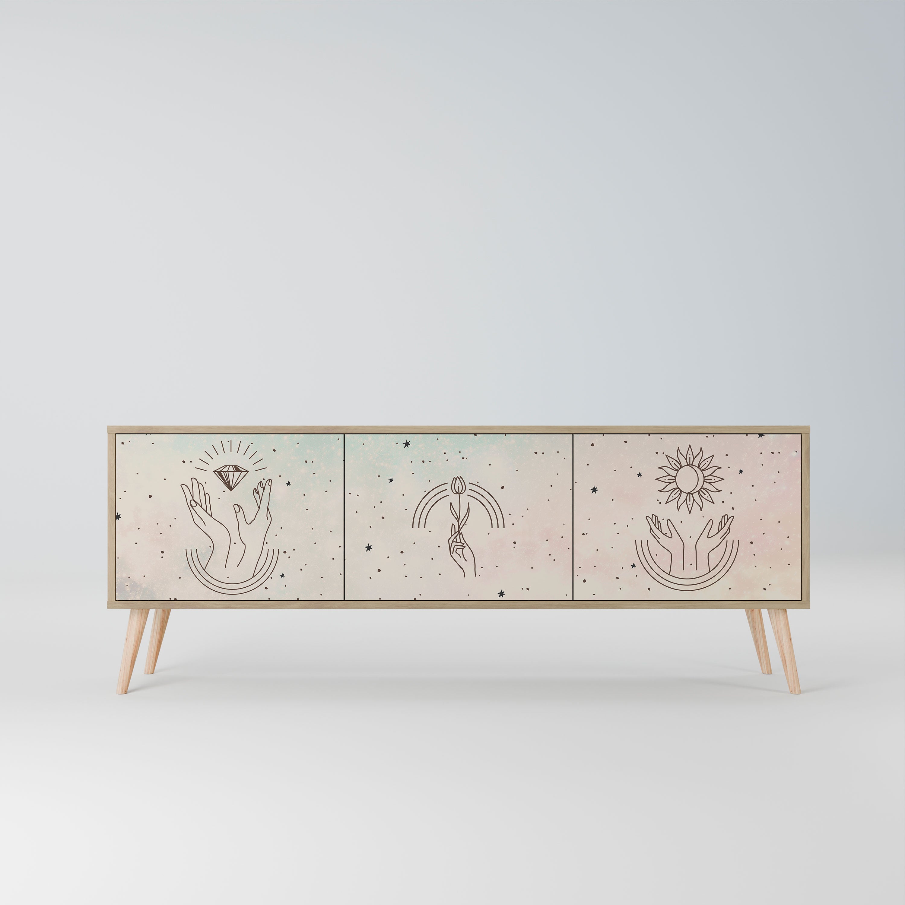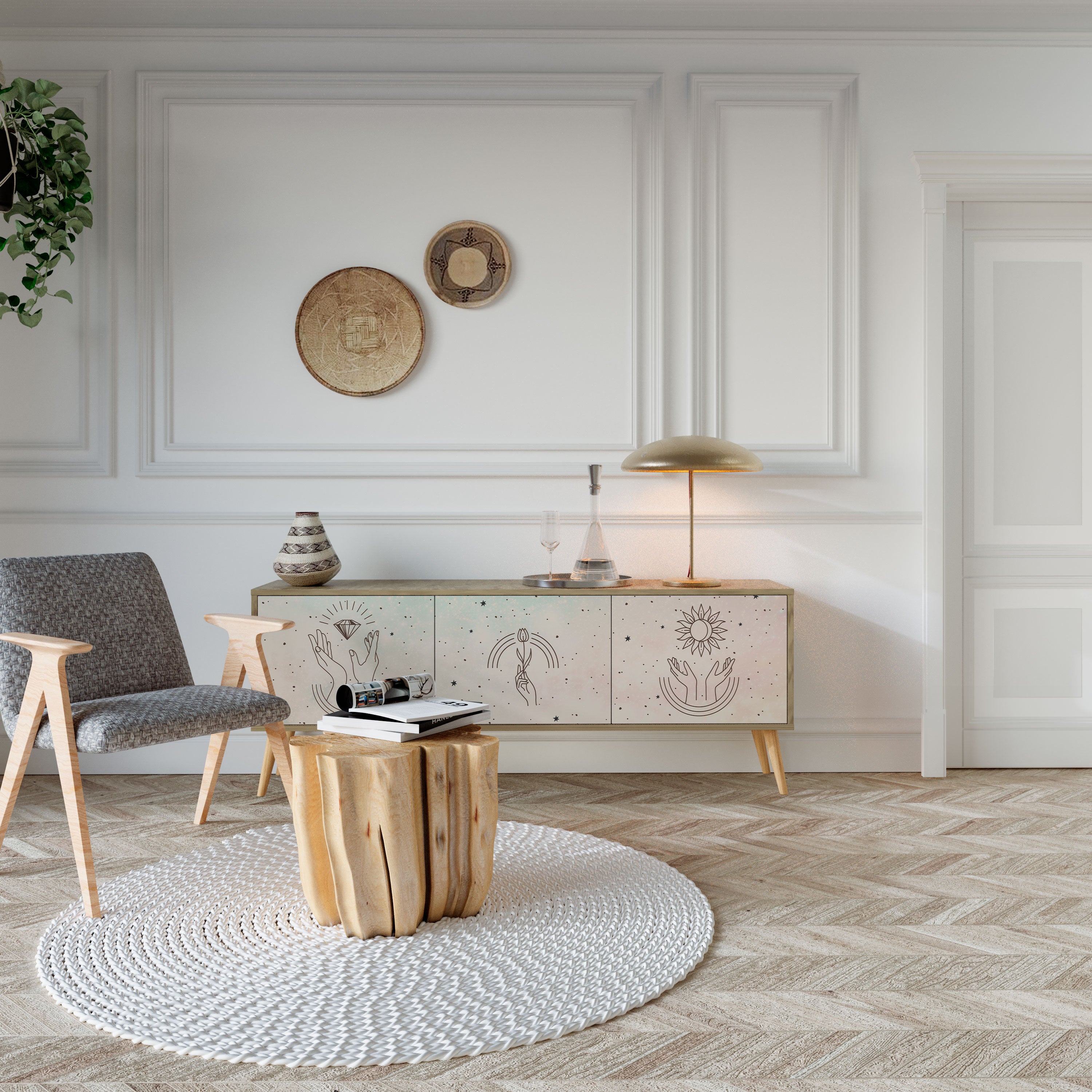 Odkryj idealne rozwiązanie do przechowywania i organizacji przestrzeni z naszą 3-drzwiową szafką pod telewizor. Wykonana z trwałych materiałów, łącząc drewniane nóżki z laminowanym korpusem, ta szafka jest zarówno stylowa, jak i funkcjonalna. Drewniane drzwiczki z atrakcyjnym nadrukiem dodają elegancji, czyniąc ją doskonałym wyborem dla każdego wnętrza.