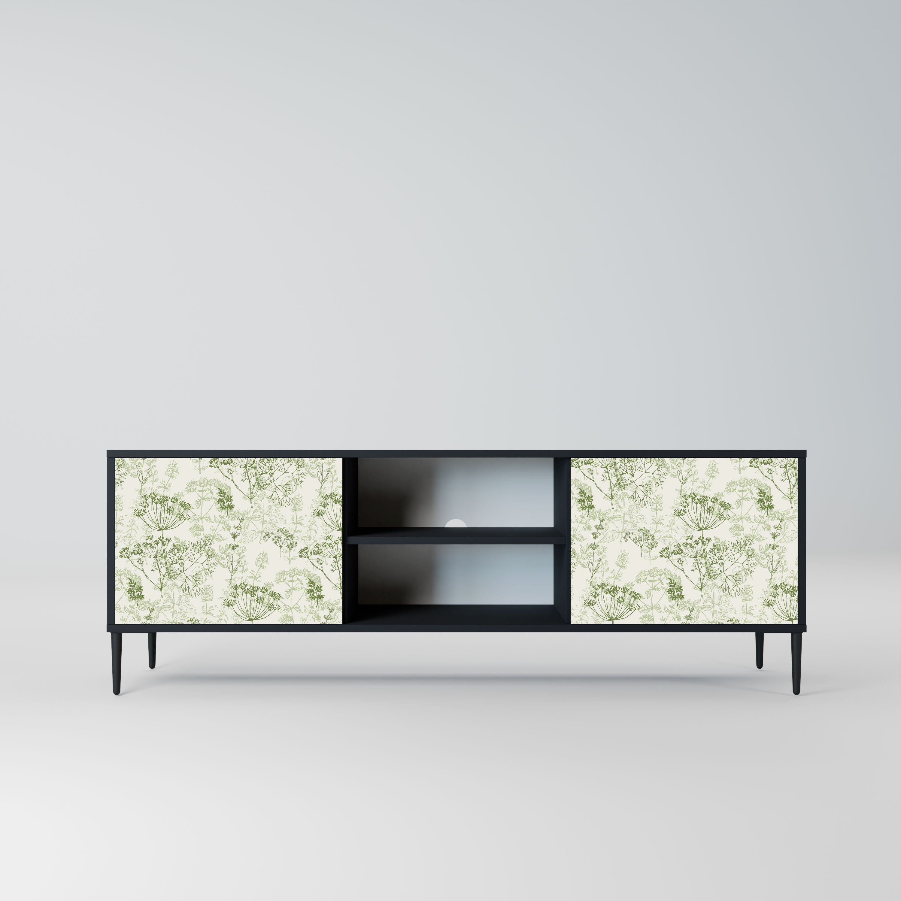 Czarny korpus nadaje szafce eleganckiego, nowoczesnego wyglądu, a fronty z wyjątkowym nadrukiem przyciągają uwagę, czyniąc ją centralnym punktem każdego pomieszczenia. Przestronne wnętrze pomieści sprzęt elektroniczny, kable, piloty i inne akcesoria, pozwalając utrzymać porządek.