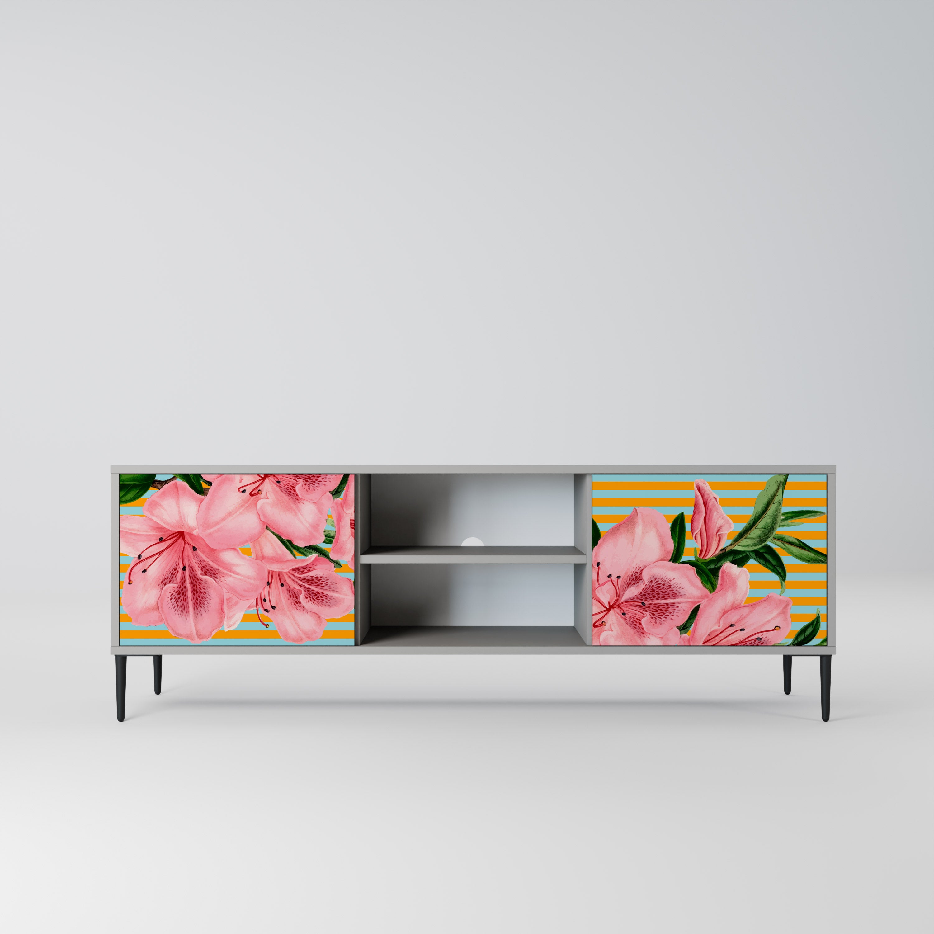 Szary korpus nadaje szafce subtelnego, a zarazem eleganckiego wyglądu, a fronty z wyjątkowym nadrukiem przyciągają uwagę, czyniąc ją centralnym punktem każdego pomieszczenia. Przestronne wnętrze pomieści sprzęt elektroniczny, kable, piloty i inne akcesoria, pozwalając utrzymać porządek.