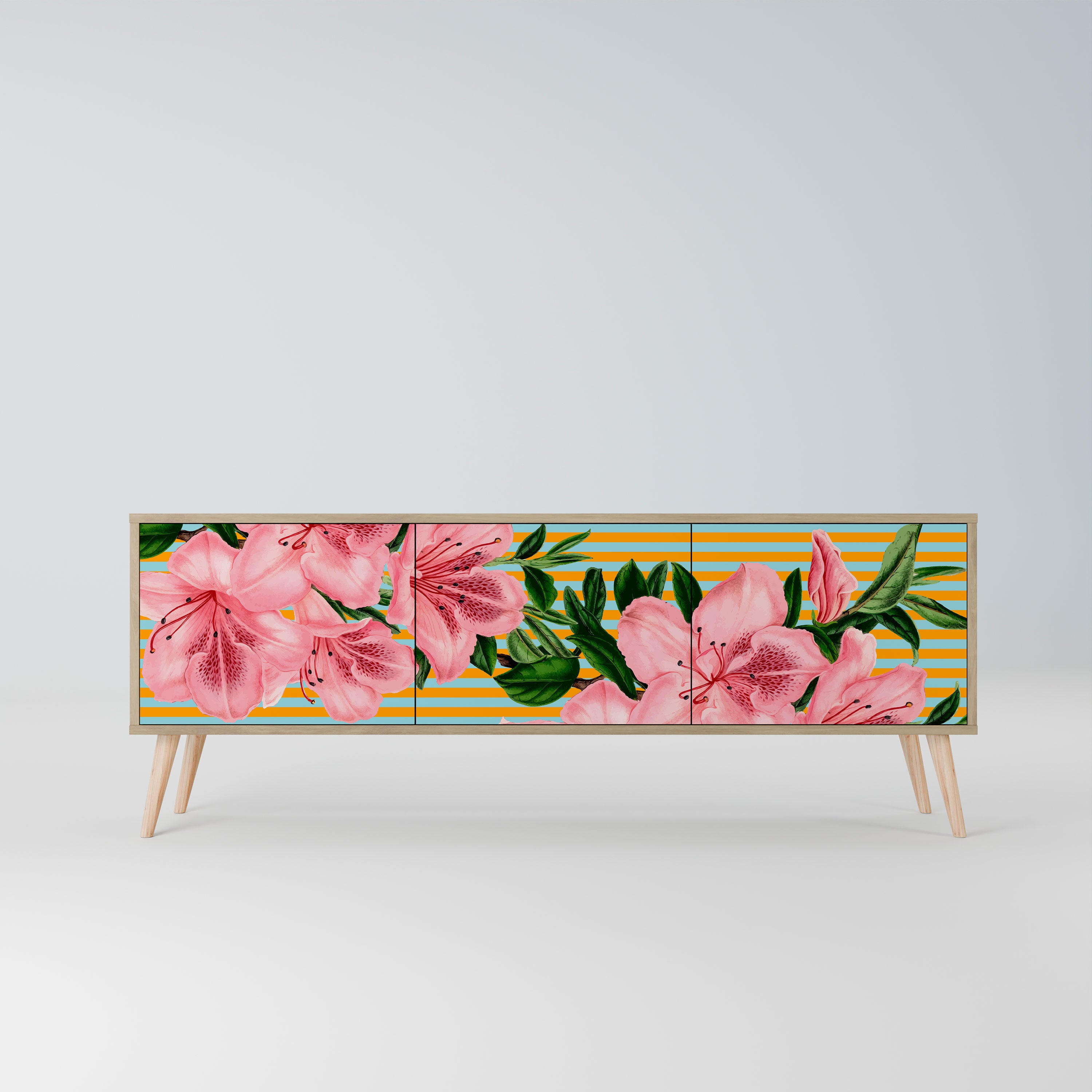 Odkryj idealne rozwiązanie do przechowywania i organizacji przestrzeni z naszą 3-drzwiową szafką pod telewizor. Wykonana z trwałych materiałów, łącząc drewniane nóżki z laminowanym korpusem, ta szafka jest zarówno stylowa, jak i funkcjonalna. Drewniane drzwiczki z atrakcyjnym nadrukiem dodają elegancji, czyniąc ją doskonałym wyborem dla każdego wnętrza.