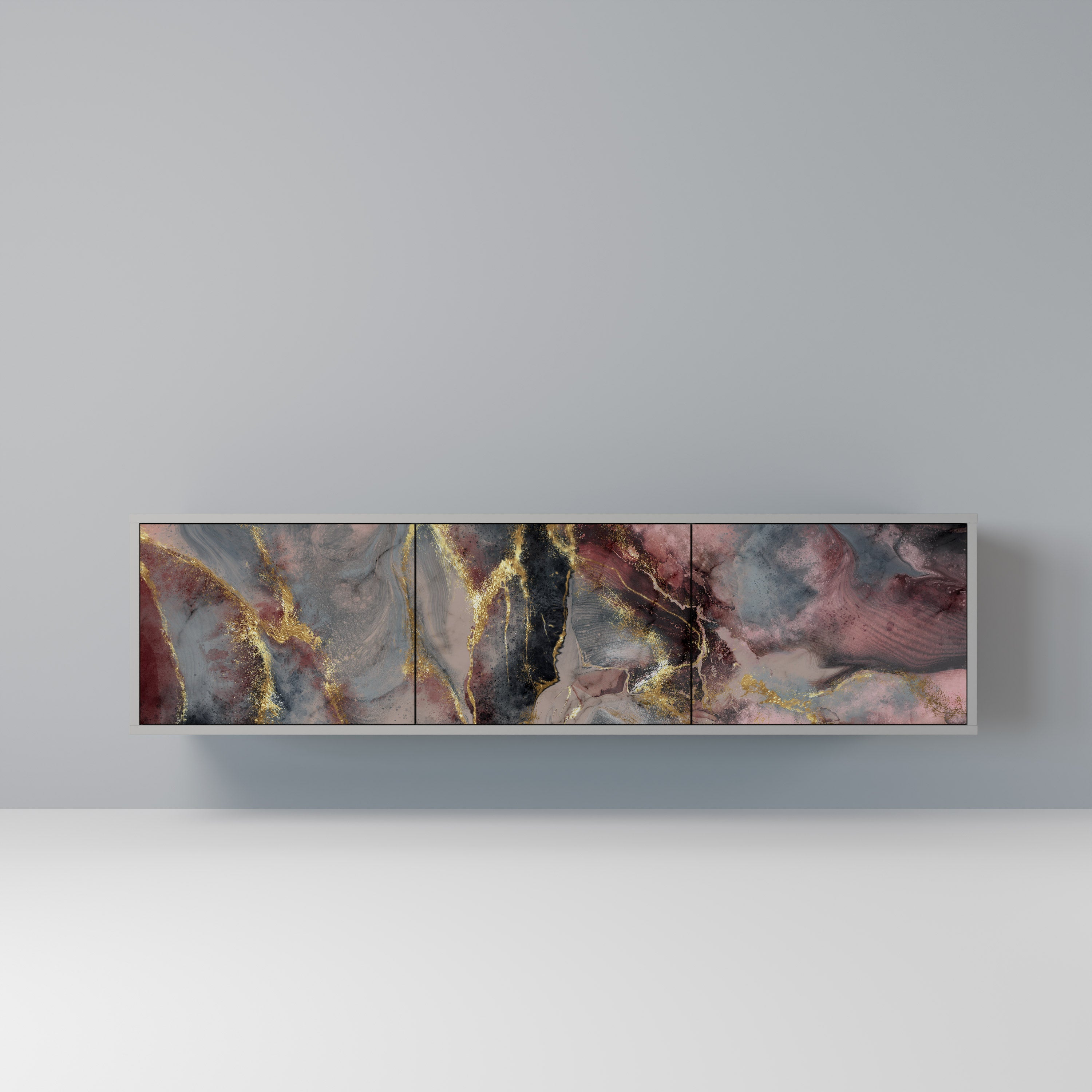Szary korpus szafki tworzy subtelny, nowoczesny akcent, który świetnie komponuje się z industrialnymi i minimalistycznymi aranżacjami. Fronty z designerskim nadrukiem dodają charakteru i niepowtarzalności, czyniąc mebel nie tylko praktycznym, ale także wyjątkowym elementem dekoracyjnym.