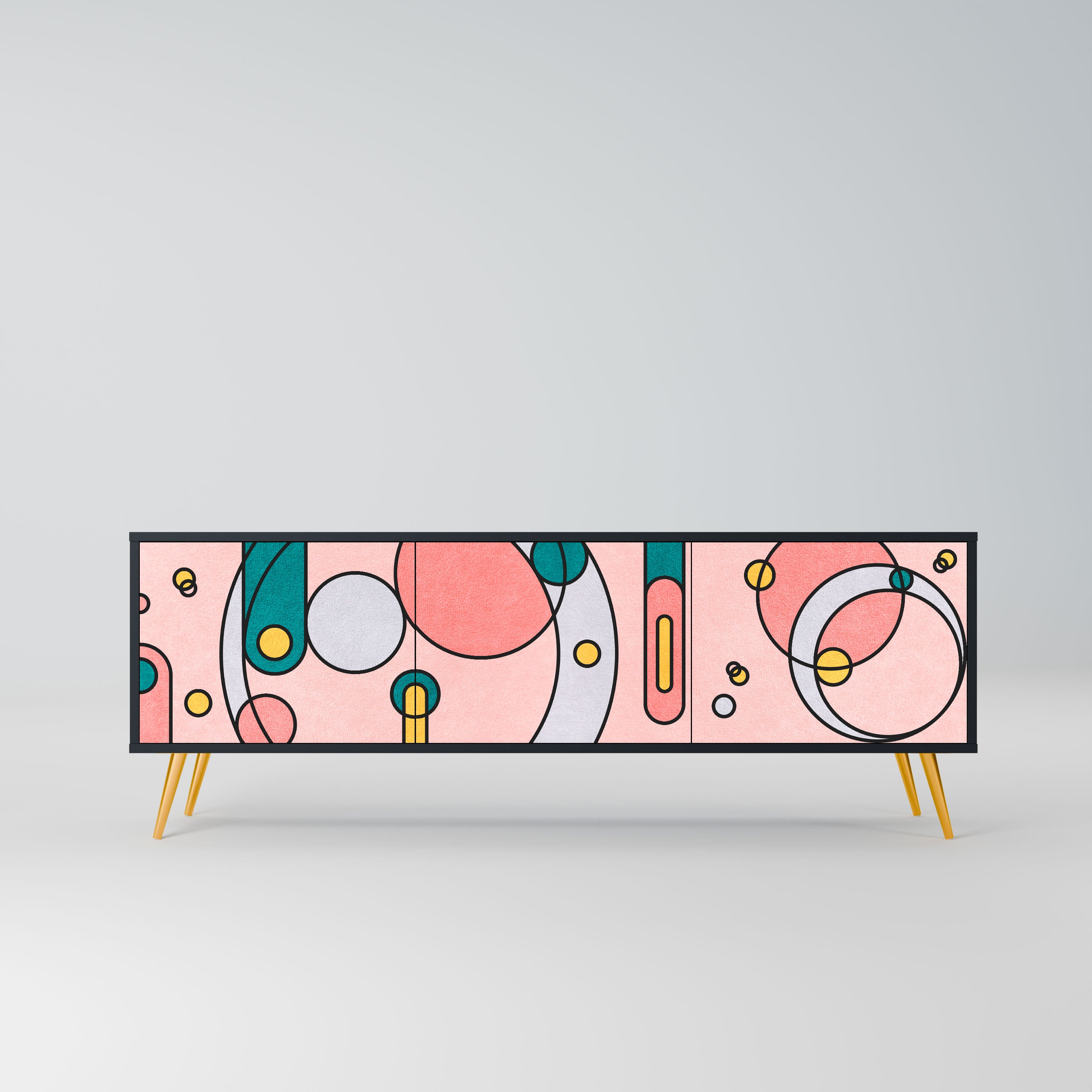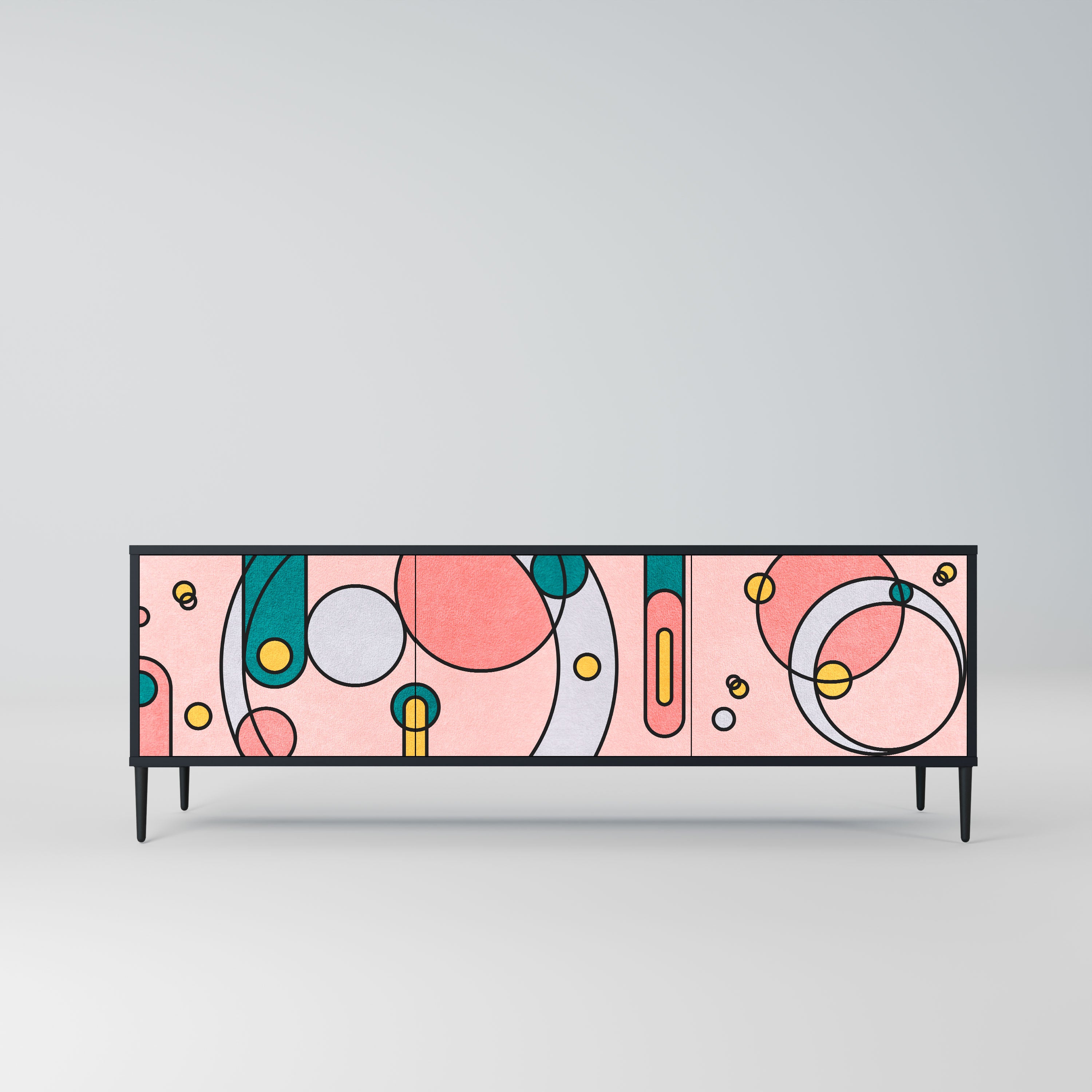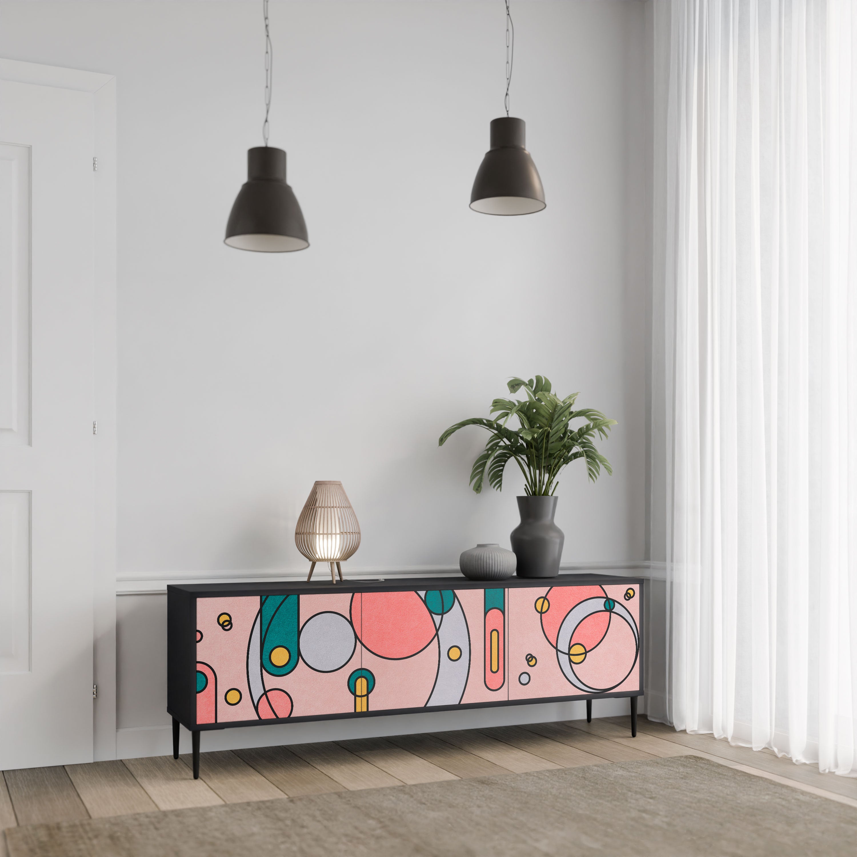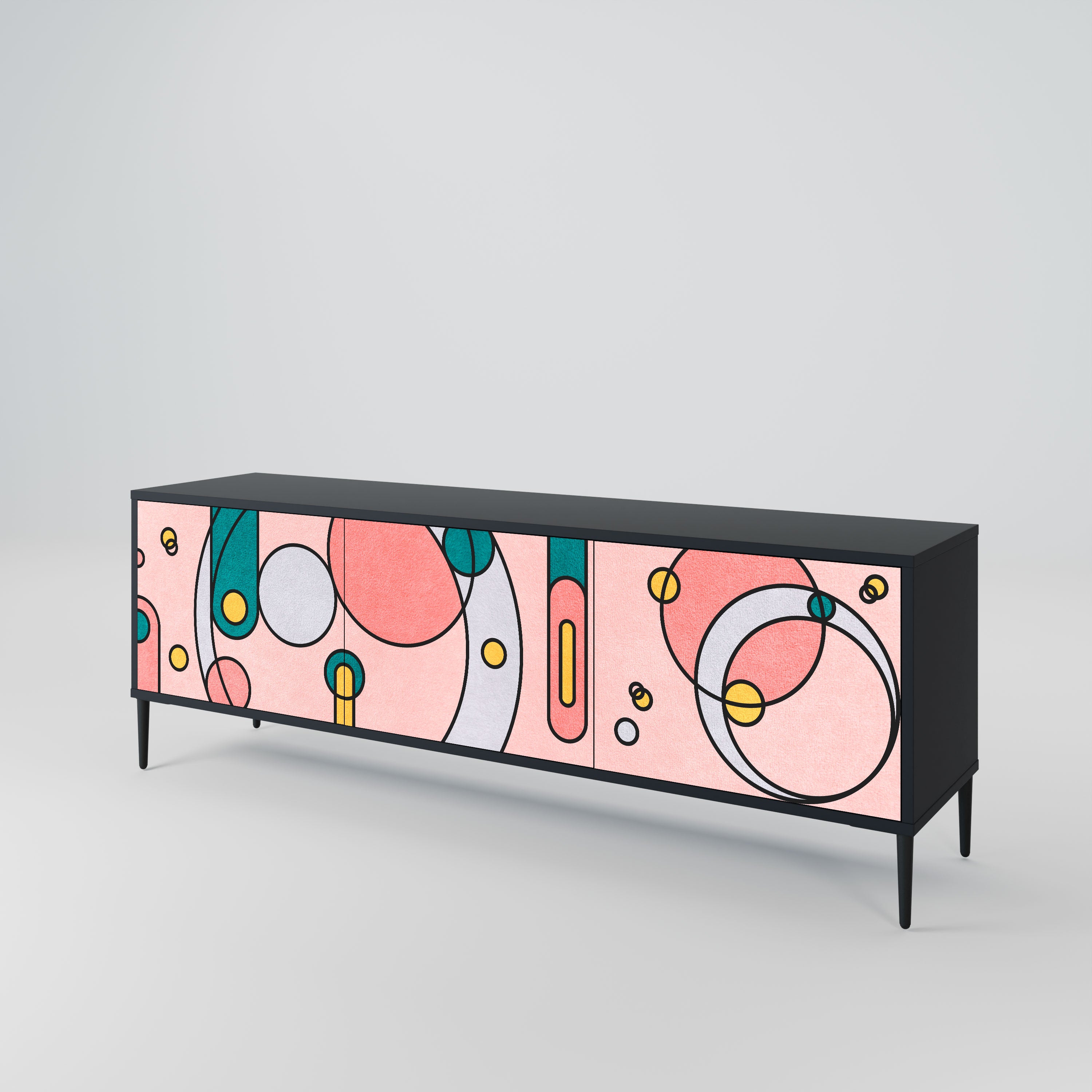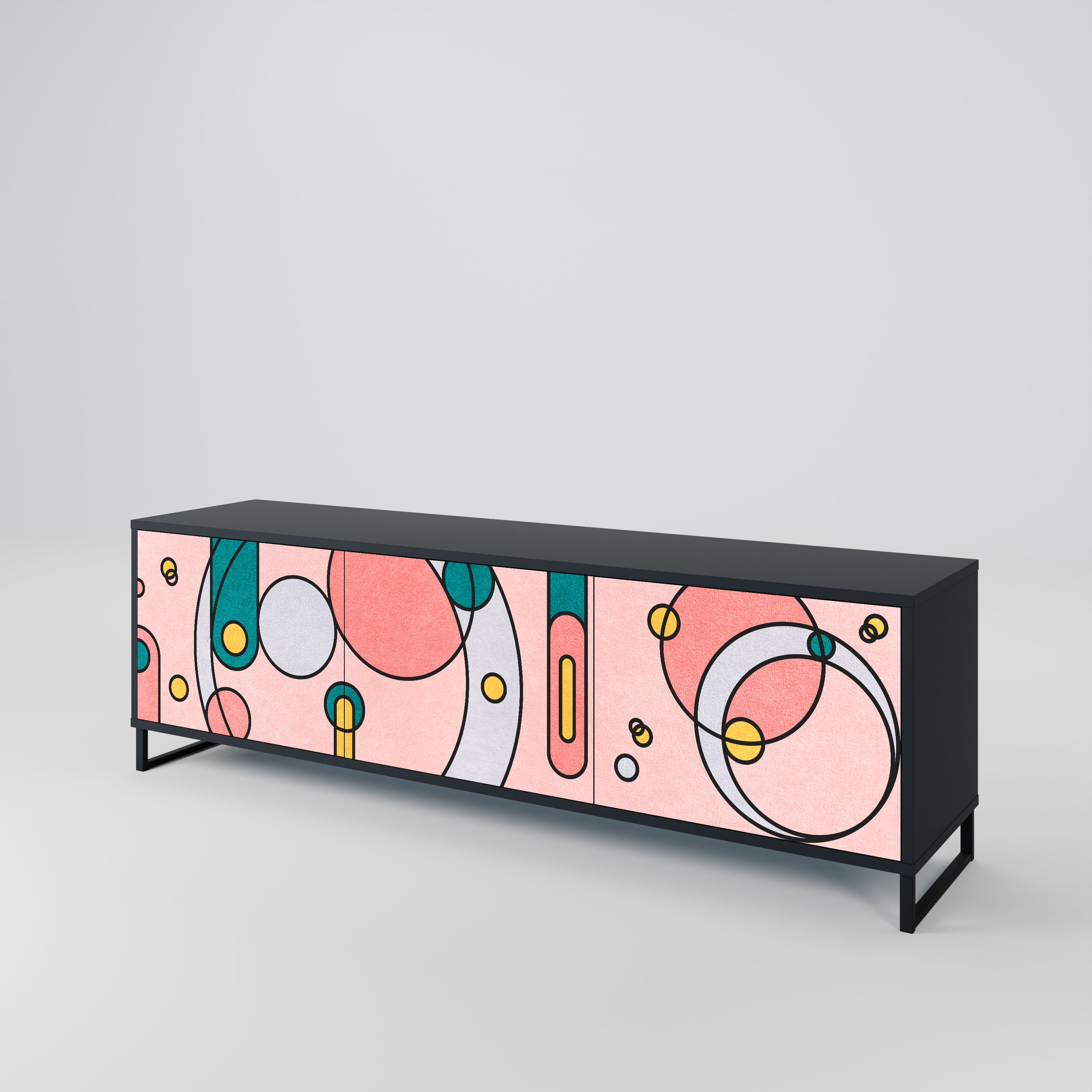 Czarny korpus szafki tworzy wyrazisty, nowoczesny akcent, który świetnie komponuje się z industrialnymi i minimalistycznymi aranżacjami. Fronty z designerskim nadrukiem dodają charakteru i niepowtarzalności, czyniąc mebel nie tylko praktycznym, ale także wyjątkowym elementem dekoracyjnym.