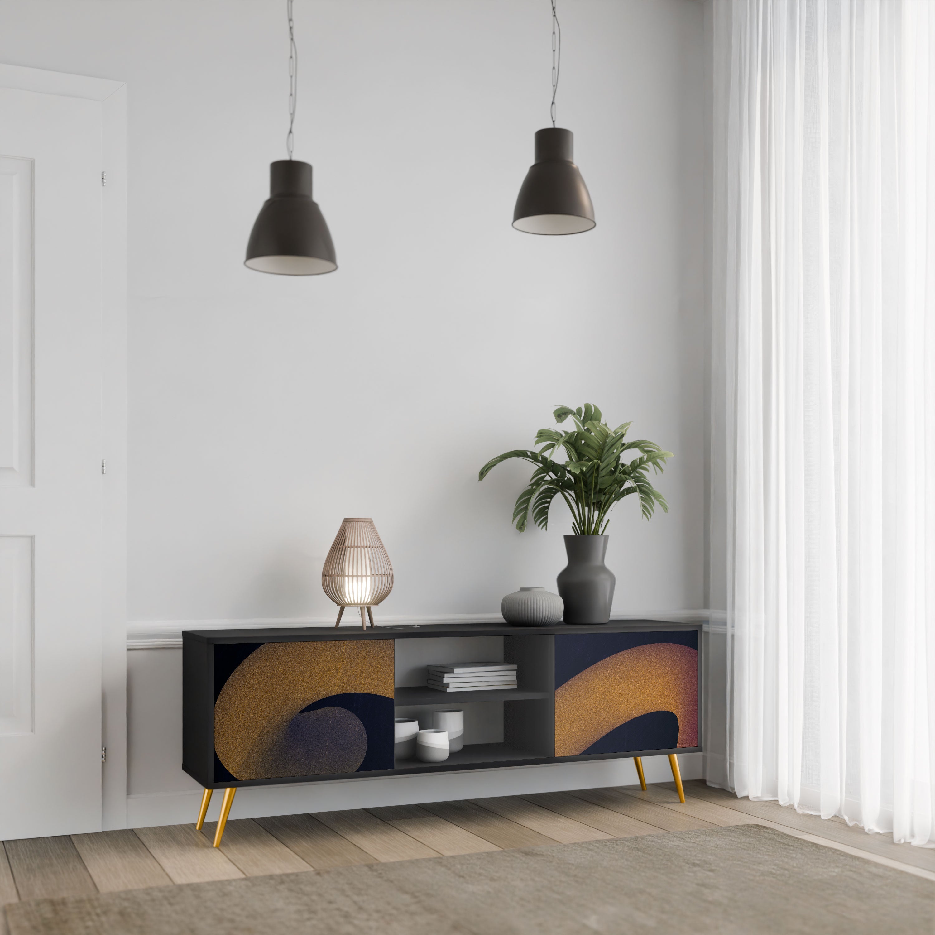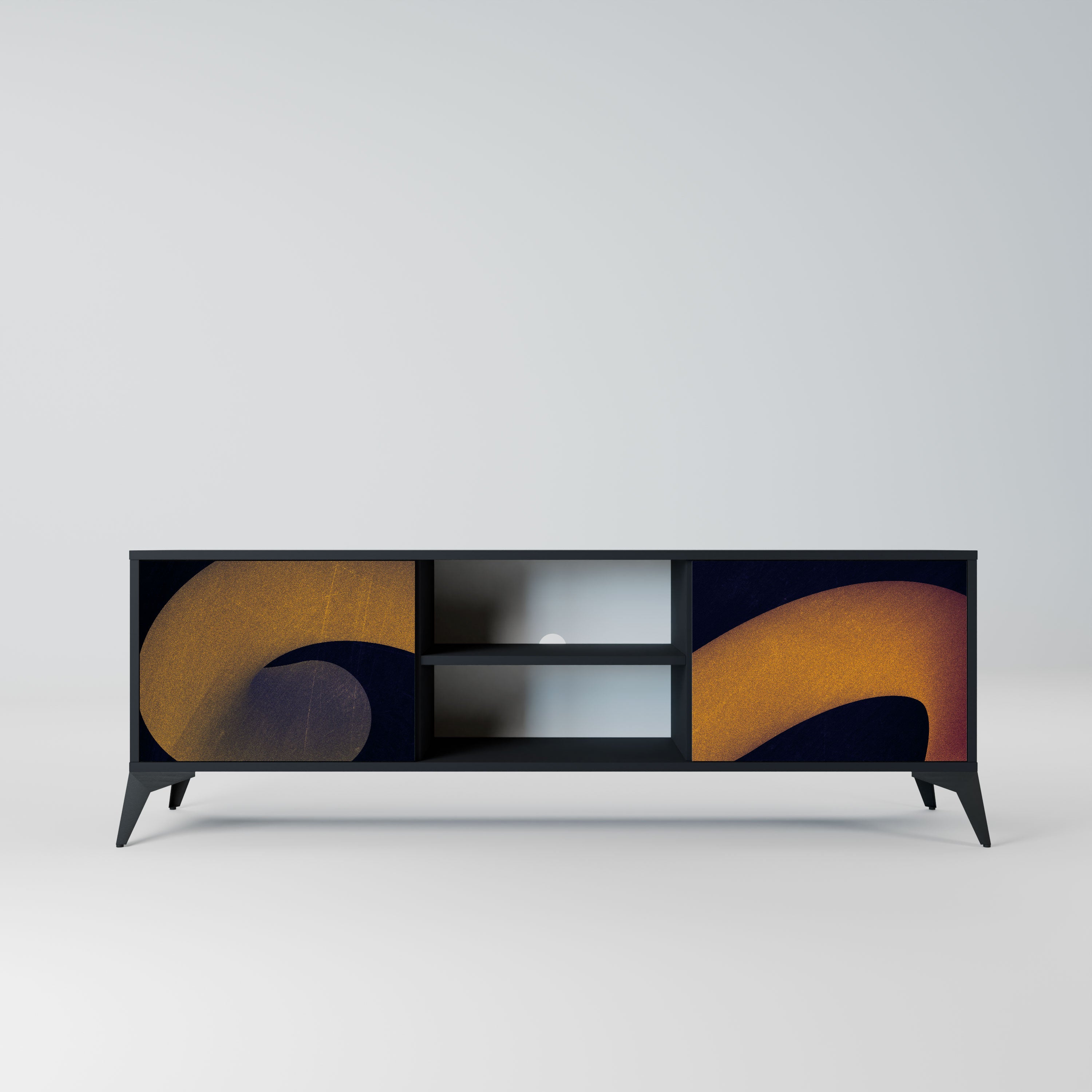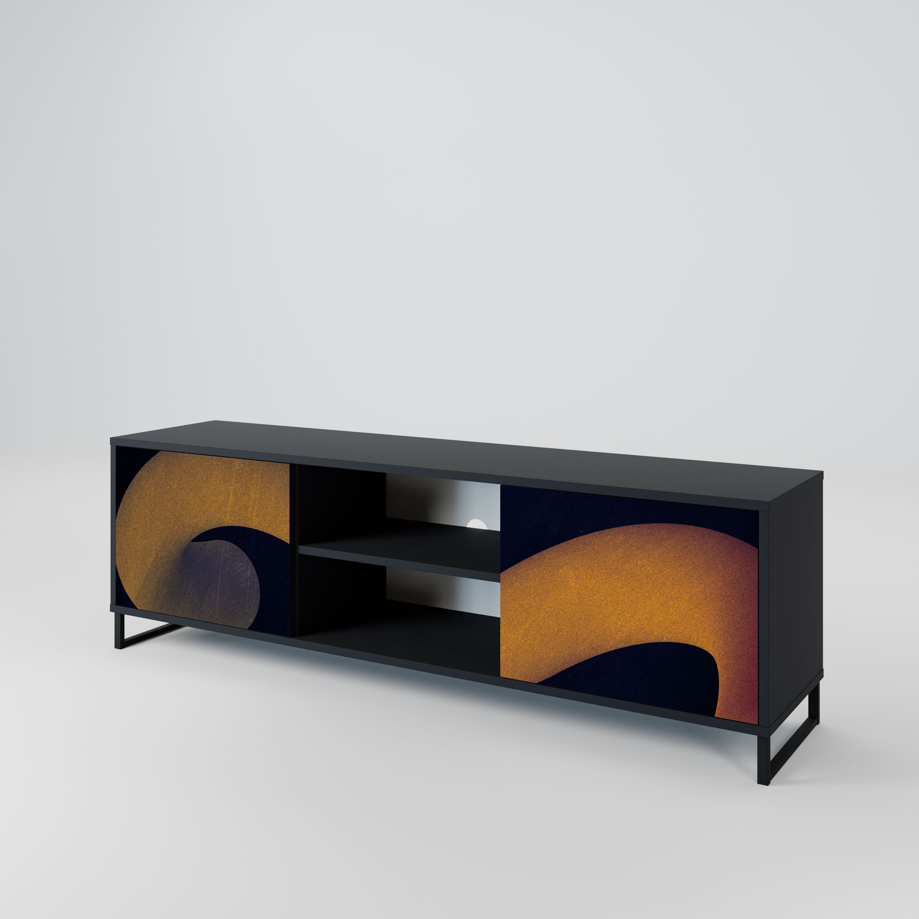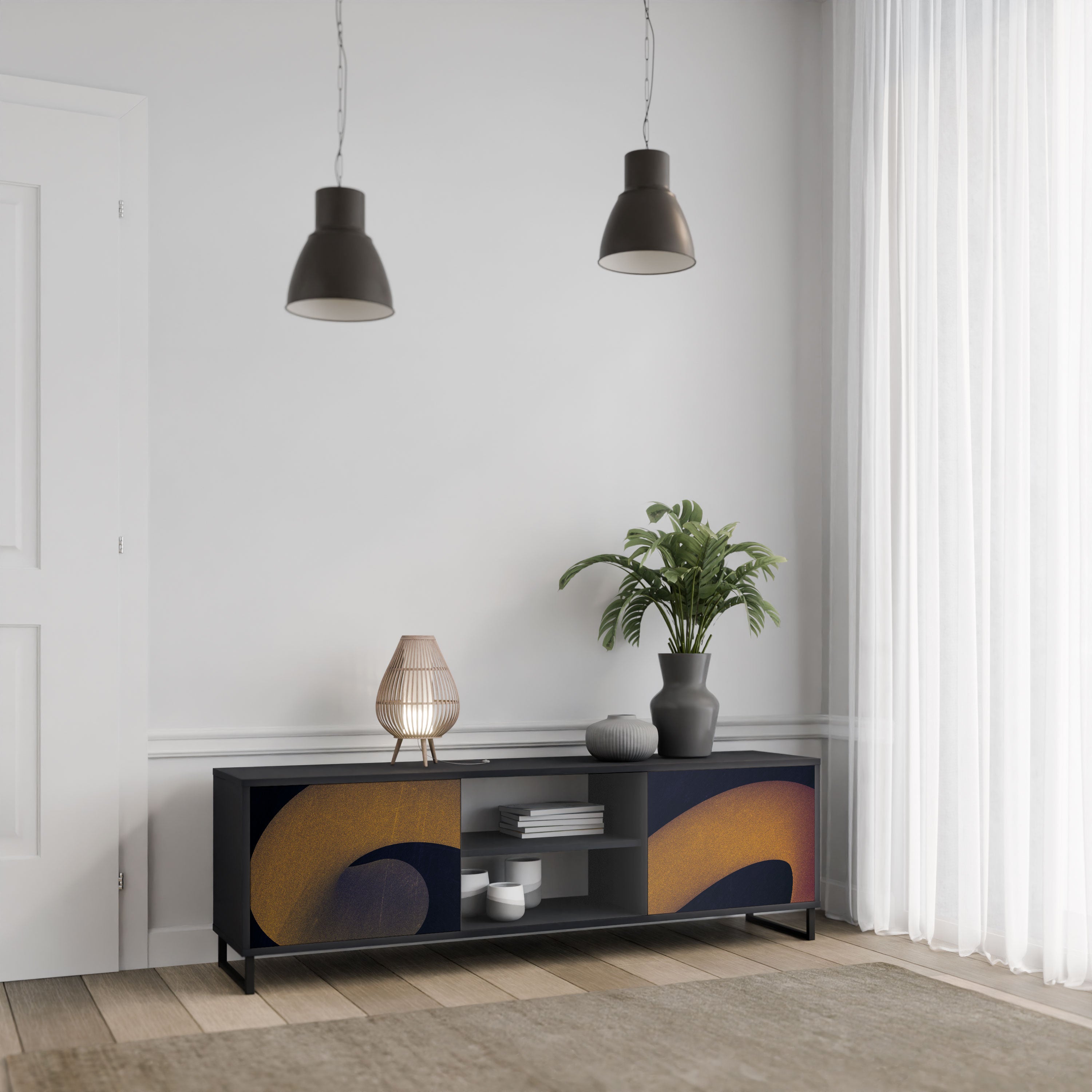Czarny korpus nadaje szafce eleganckiego, nowoczesnego wyglądu, a fronty z wyjątkowym nadrukiem przyciągają uwagę, czyniąc ją centralnym punktem każdego pomieszczenia. Przestronne wnętrze pomieści sprzęt elektroniczny, kable, piloty i inne akcesoria, pozwalając utrzymać porządek.