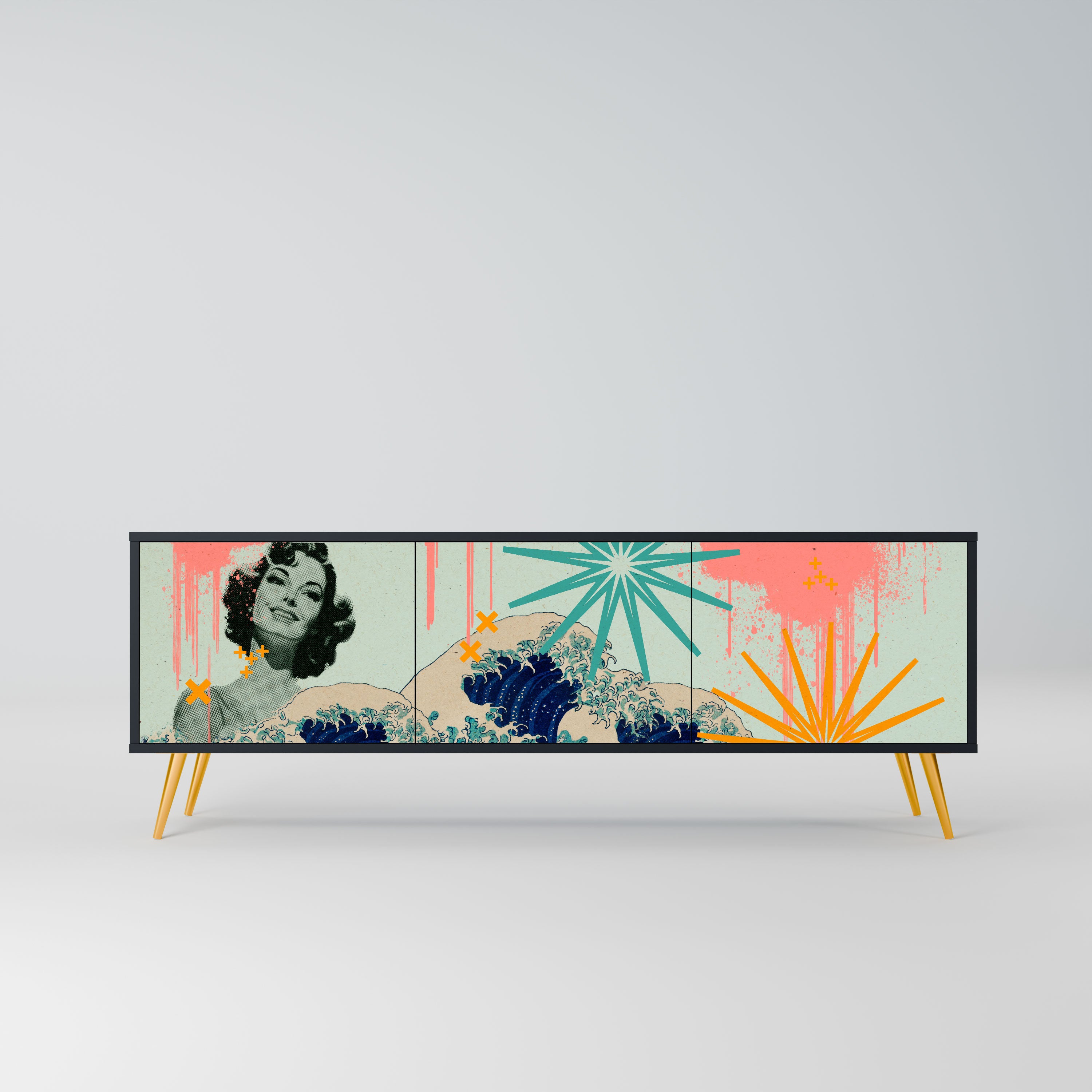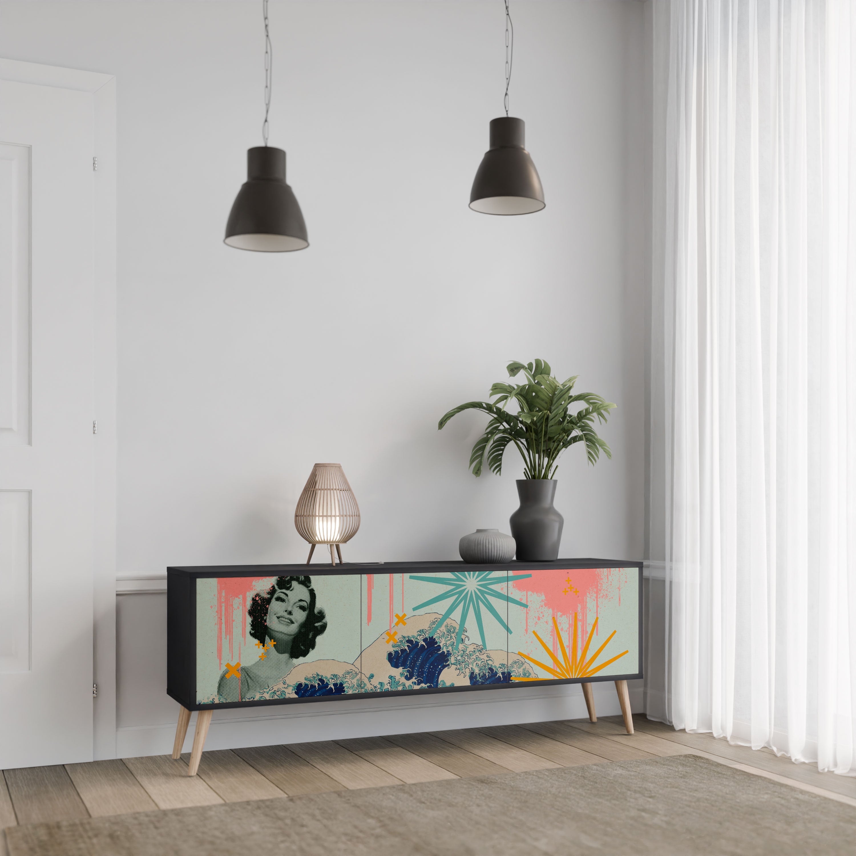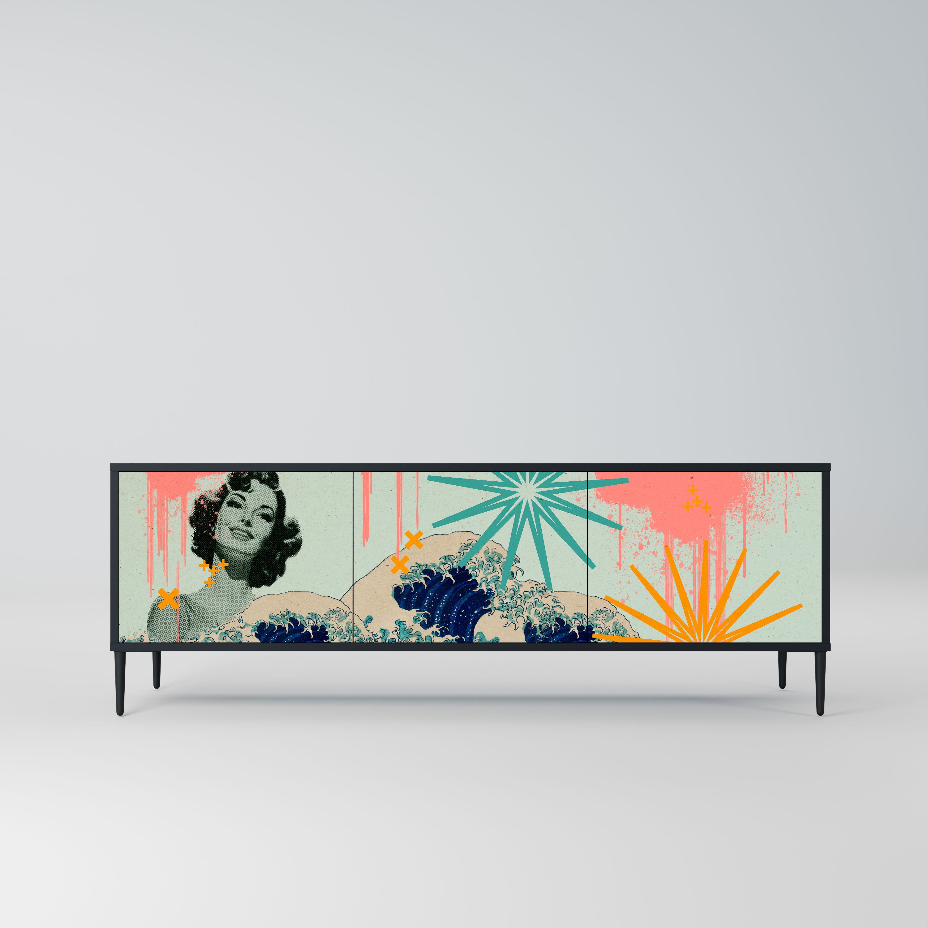 Czarny korpus szafki tworzy wyrazisty, nowoczesny akcent, który świetnie komponuje się z industrialnymi i minimalistycznymi aranżacjami. Fronty z designerskim nadrukiem dodają charakteru i niepowtarzalności, czyniąc mebel nie tylko praktycznym, ale także wyjątkowym elementem dekoracyjnym.