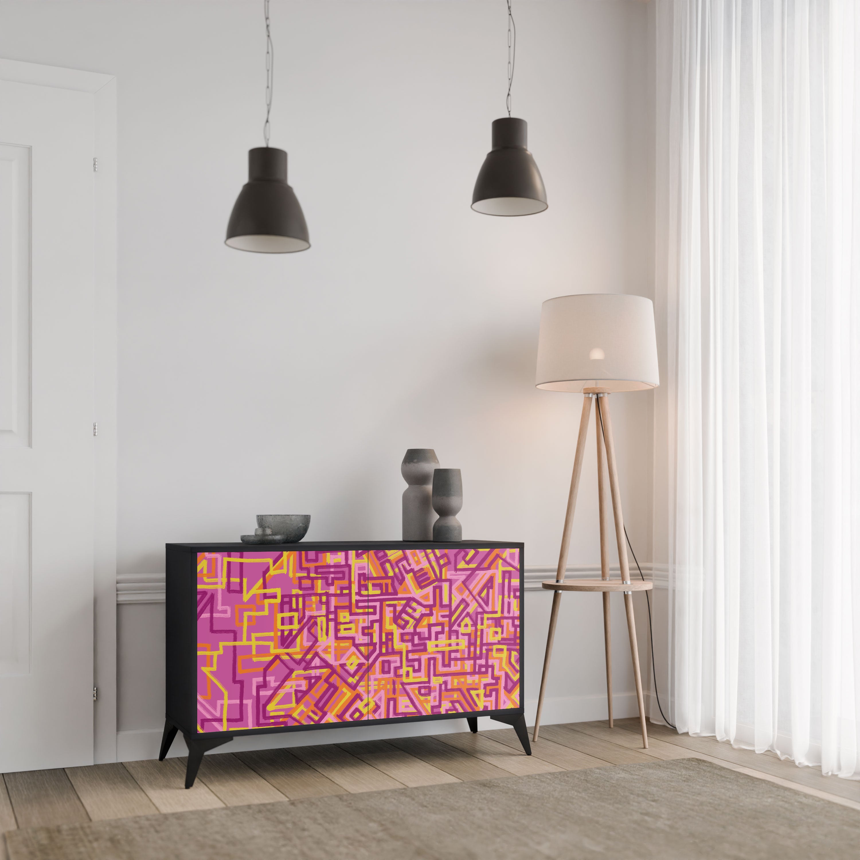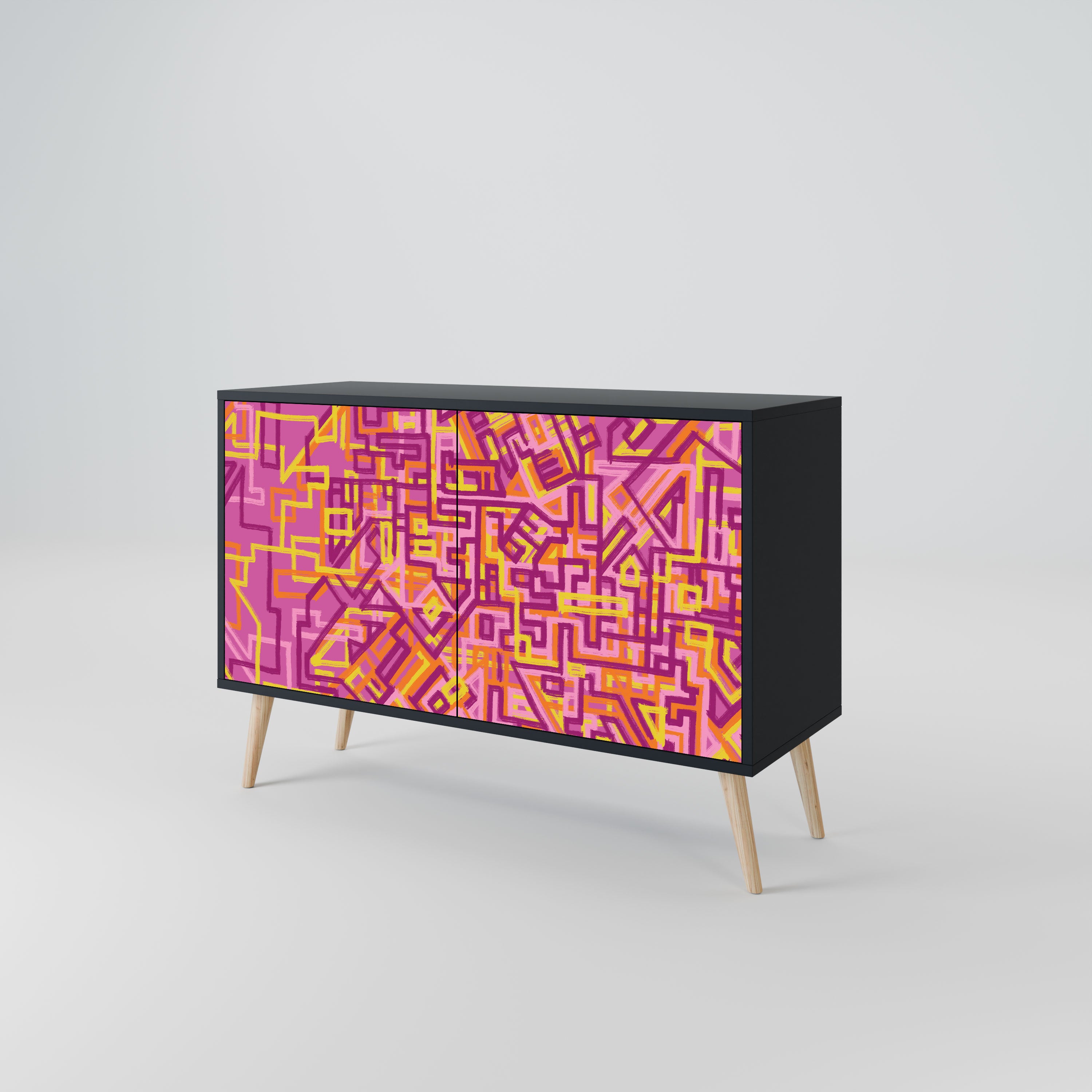 Elegancja i funkcjonalność w jednym meblu – nasza 2-drzwiowa komoda z czarnym korpusem to idealne rozwiązanie dla miłośników stylowych, nowoczesnych wnętrz. Czerń korpusu podkreśla wyrazisty charakter mebla, a fronty z unikalnym nadrukiem dodają artystycznego wyrazu. Doskonale sprawdzi się w salonie, sypialni czy gabinecie, zarówno w aranżacjach nowoczesnych, jak i industrialnych.