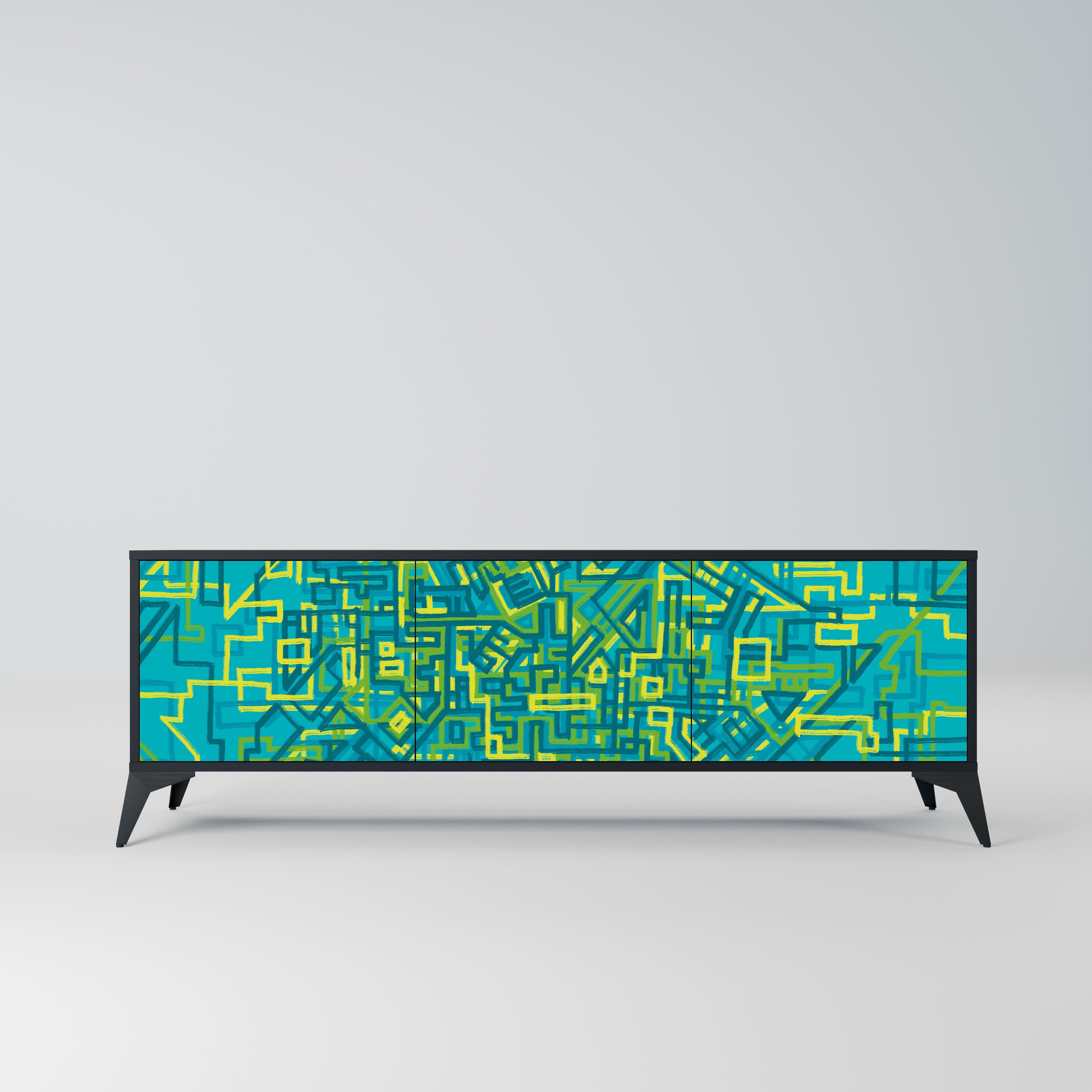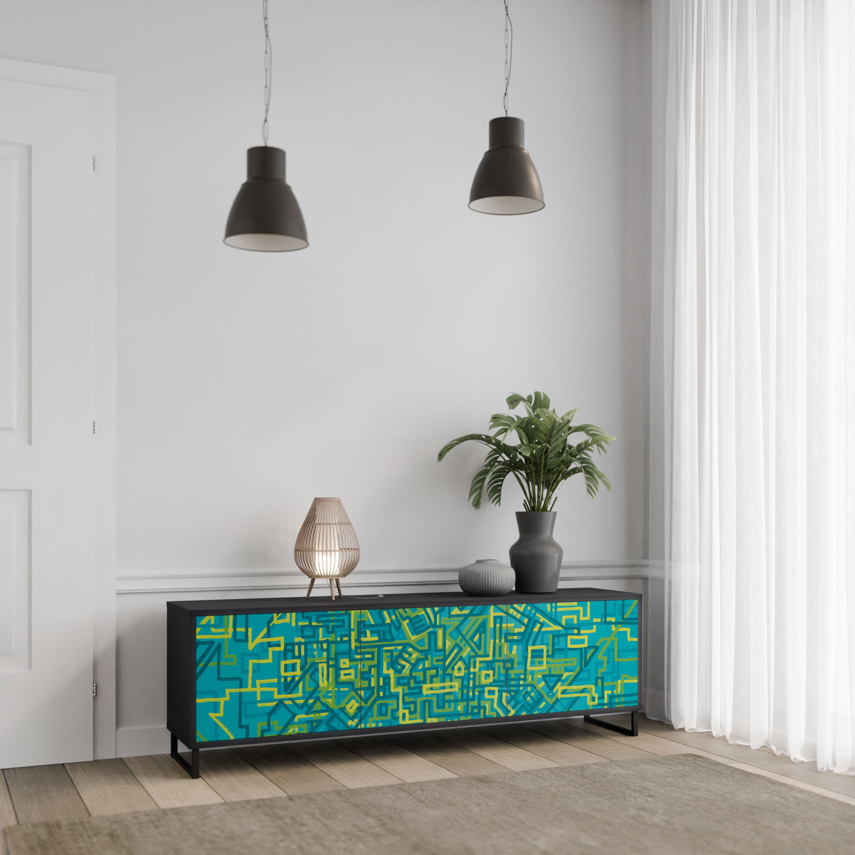 Czarny korpus szafki tworzy wyrazisty, nowoczesny akcent, który świetnie komponuje się z industrialnymi i minimalistycznymi aranżacjami. Fronty z designerskim nadrukiem dodają charakteru i niepowtarzalności, czyniąc mebel nie tylko praktycznym, ale także wyjątkowym elementem dekoracyjnym.