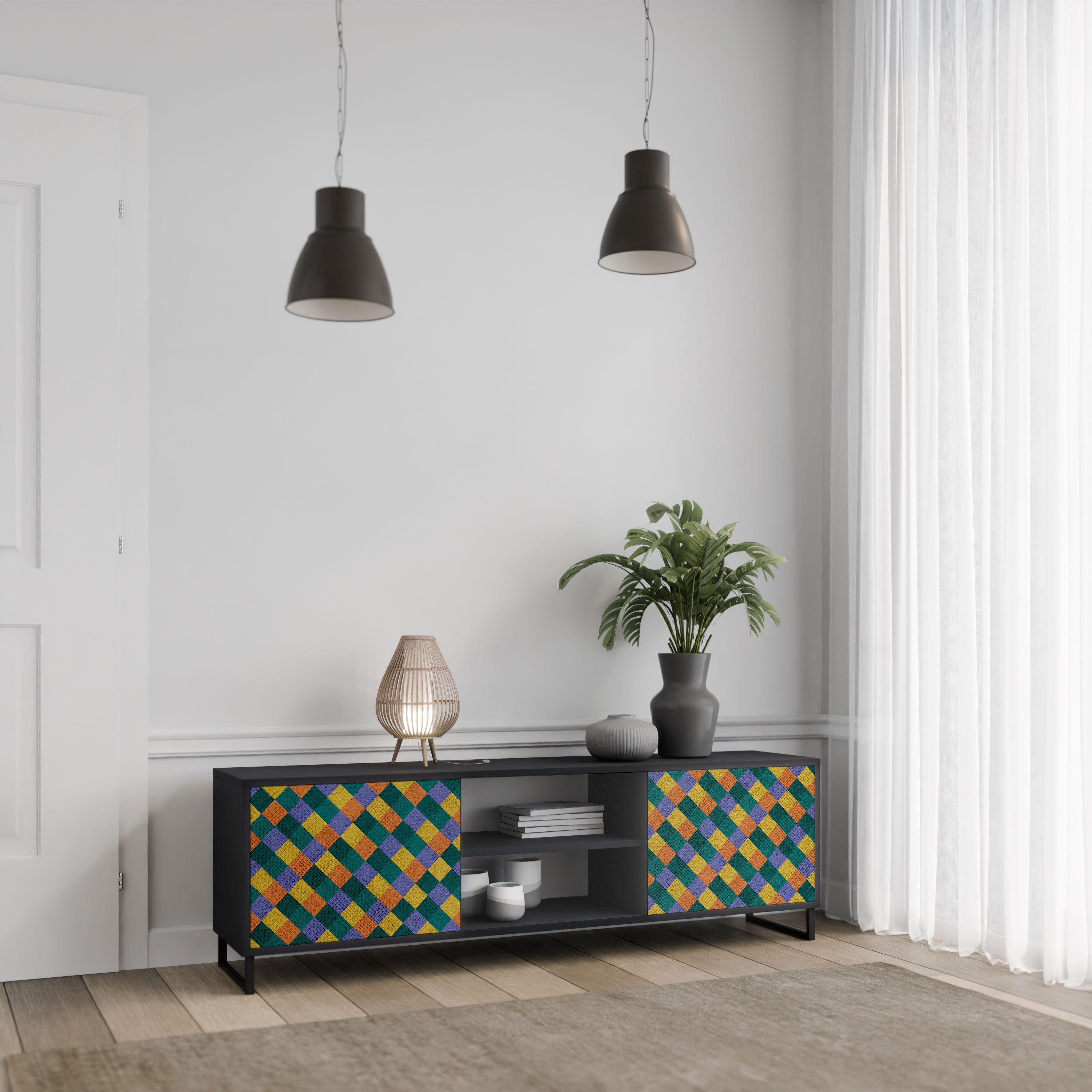 Czarny korpus nadaje szafce eleganckiego, nowoczesnego wyglądu, a fronty z wyjątkowym nadrukiem przyciągają uwagę, czyniąc ją centralnym punktem każdego pomieszczenia. Przestronne wnętrze pomieści sprzęt elektroniczny, kable, piloty i inne akcesoria, pozwalając utrzymać porządek.