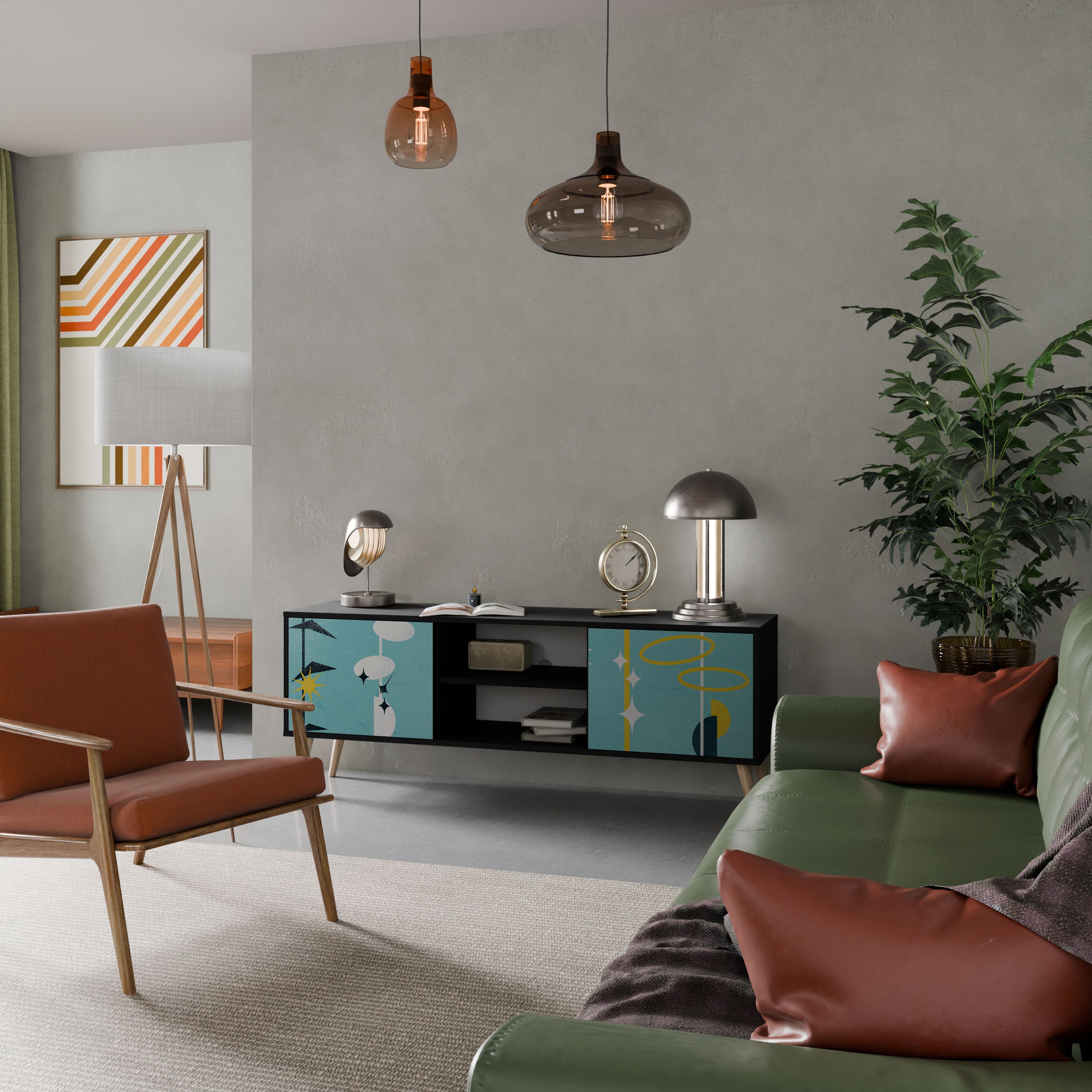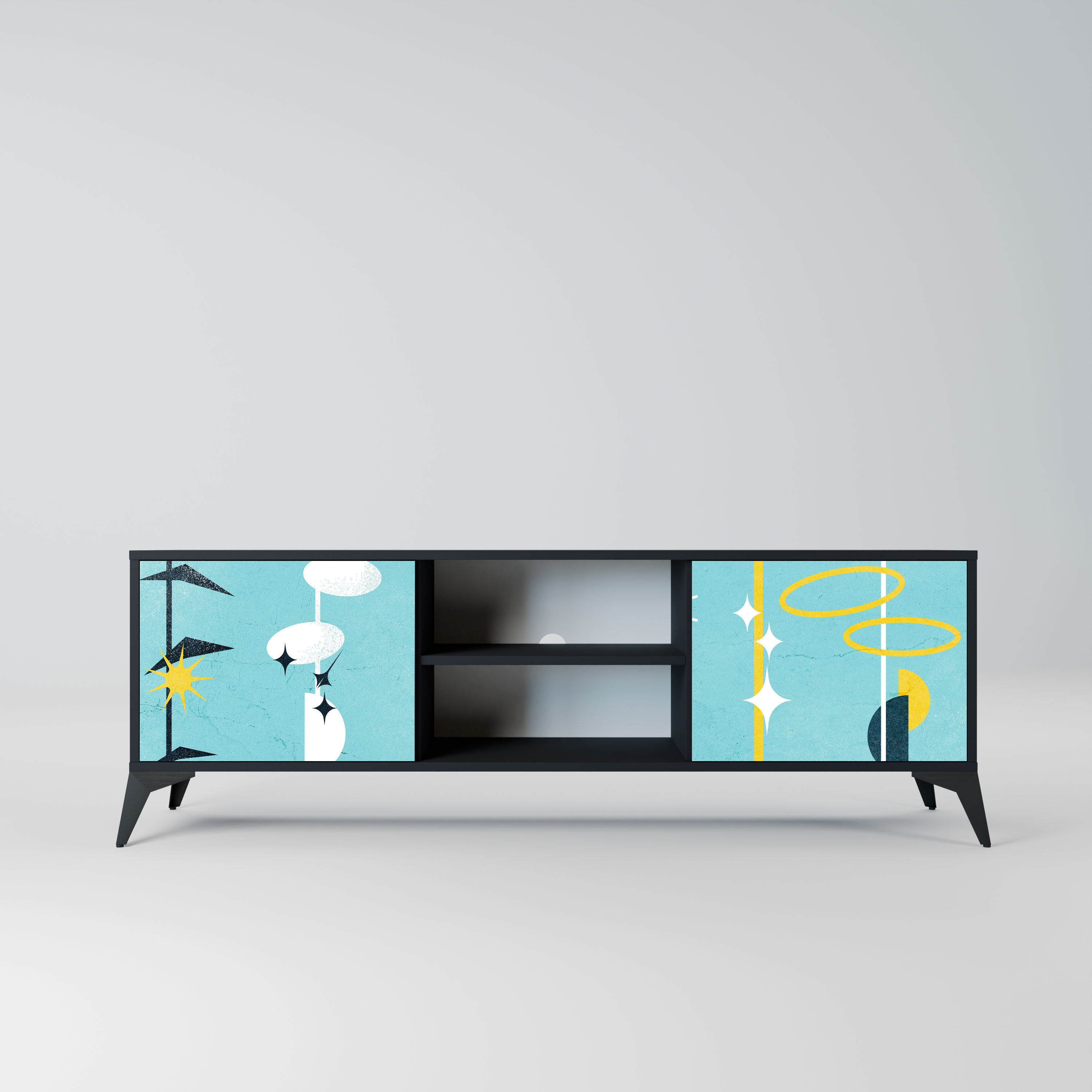 Czarny korpus nadaje szafce eleganckiego, nowoczesnego wyglądu, a fronty z wyjątkowym nadrukiem przyciągają uwagę, czyniąc ją centralnym punktem każdego pomieszczenia. Przestronne wnętrze pomieści sprzęt elektroniczny, kable, piloty i inne akcesoria, pozwalając utrzymać porządek.