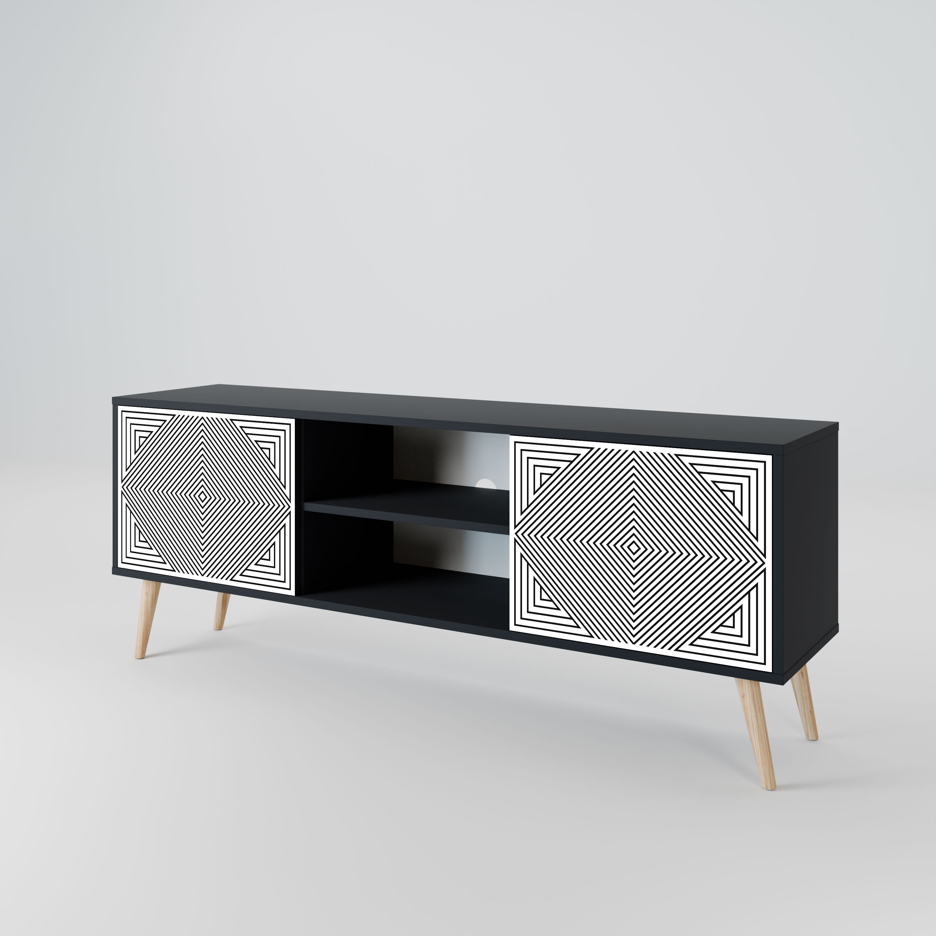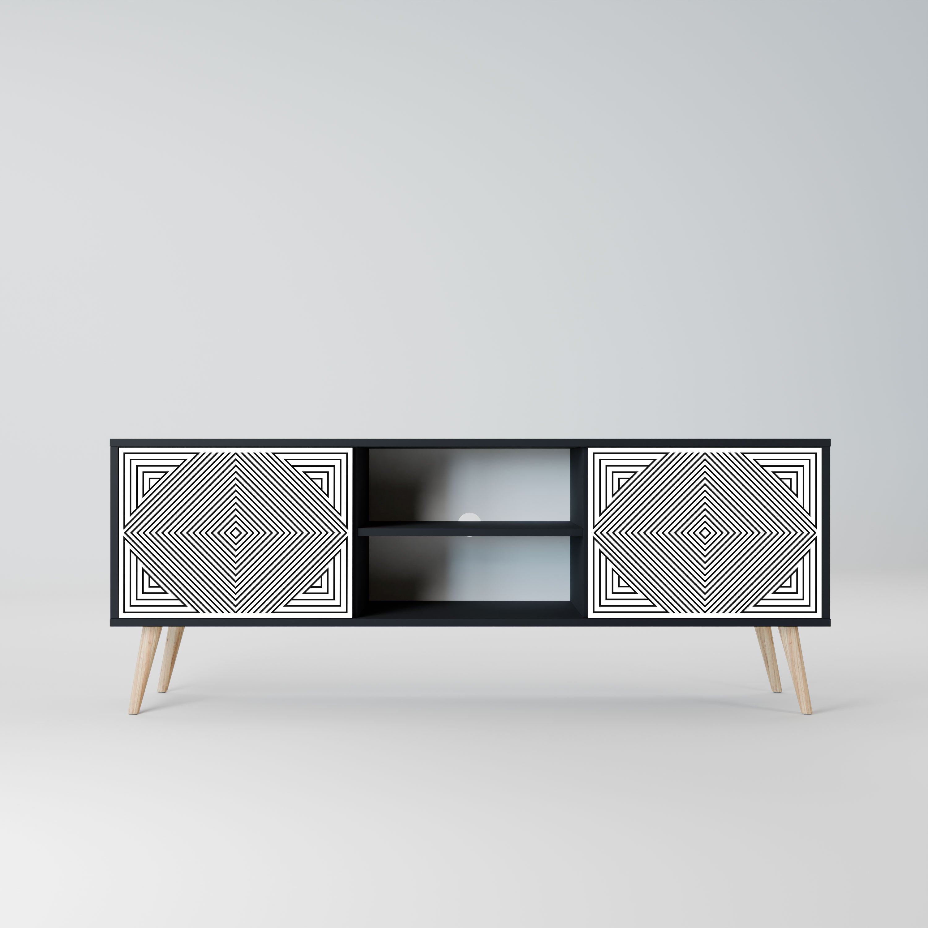 Czarny korpus nadaje szafce eleganckiego, nowoczesnego wyglądu, a fronty z wyjątkowym nadrukiem przyciągają uwagę, czyniąc ją centralnym punktem każdego pomieszczenia. Przestronne wnętrze pomieści sprzęt elektroniczny, kable, piloty i inne akcesoria, pozwalając utrzymać porządek.