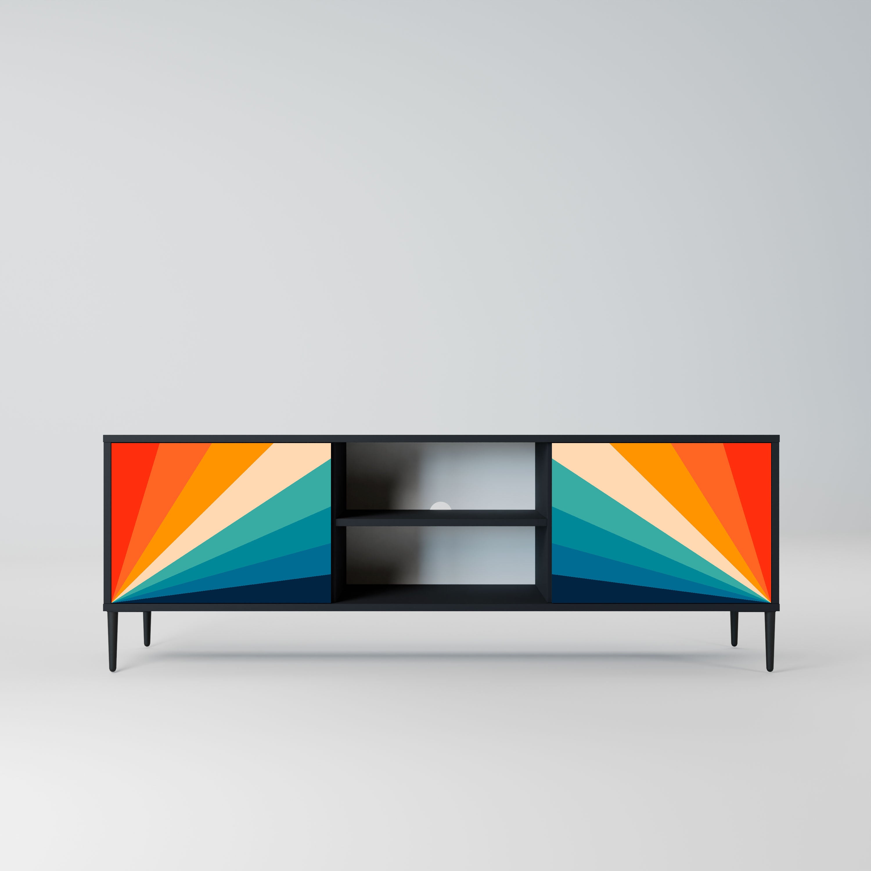 Czarny korpus nadaje szafce eleganckiego, nowoczesnego wyglądu, a fronty z wyjątkowym nadrukiem przyciągają uwagę, czyniąc ją centralnym punktem każdego pomieszczenia. Przestronne wnętrze pomieści sprzęt elektroniczny, kable, piloty i inne akcesoria, pozwalając utrzymać porządek.