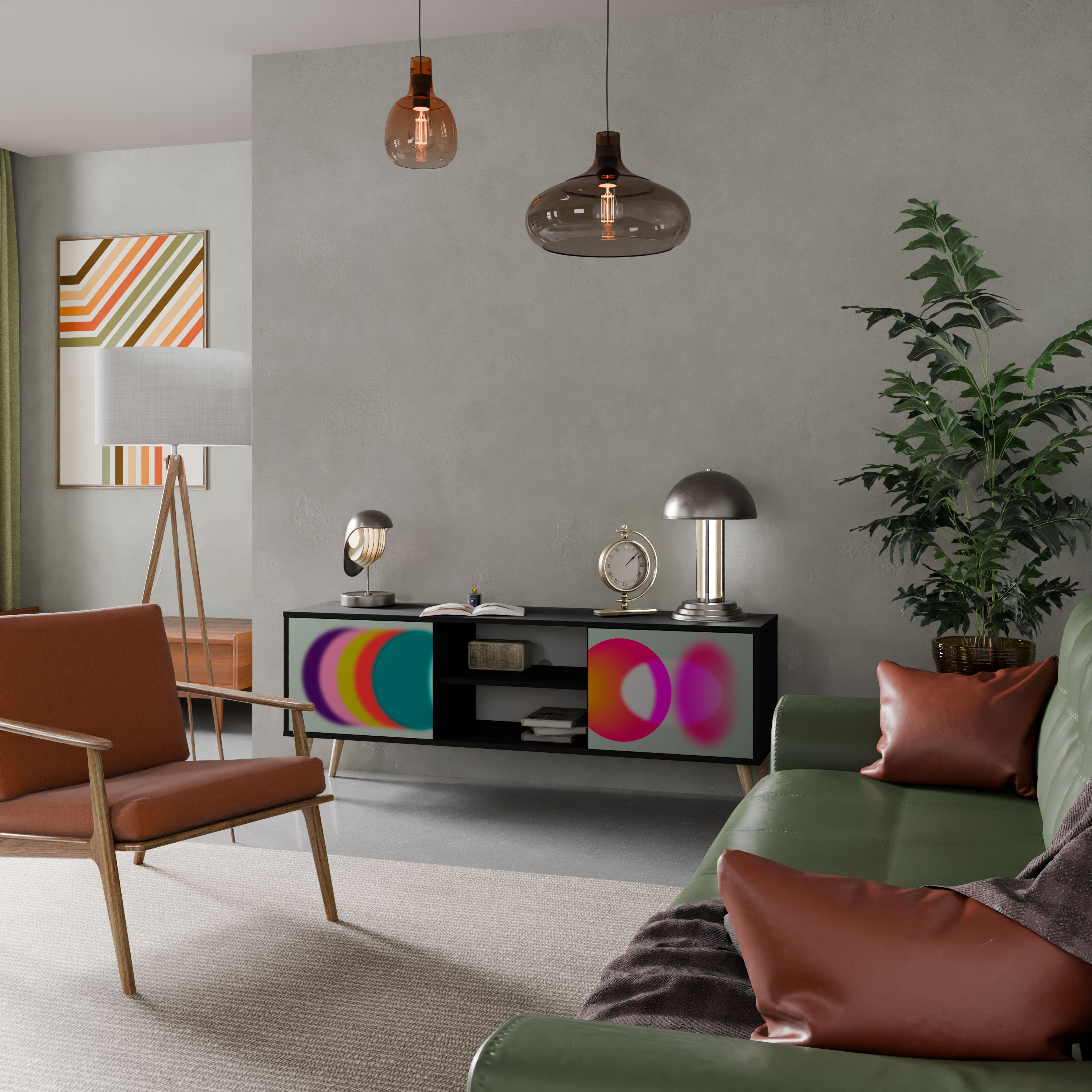 Czarny korpus nadaje szafce eleganckiego, nowoczesnego wyglądu, a fronty z wyjątkowym nadrukiem przyciągają uwagę, czyniąc ją centralnym punktem każdego pomieszczenia. Przestronne wnętrze pomieści sprzęt elektroniczny, kable, piloty i inne akcesoria, pozwalając utrzymać porządek.