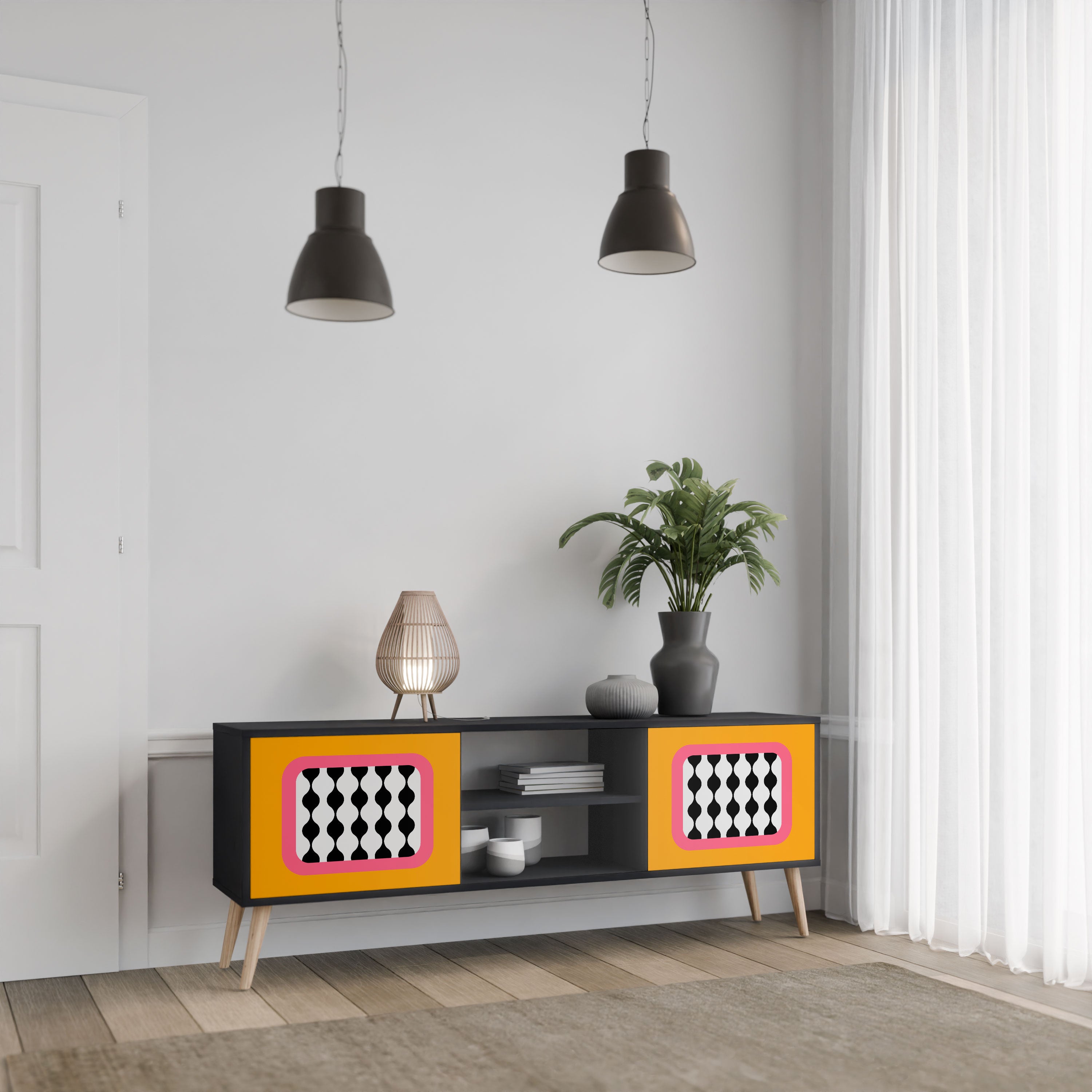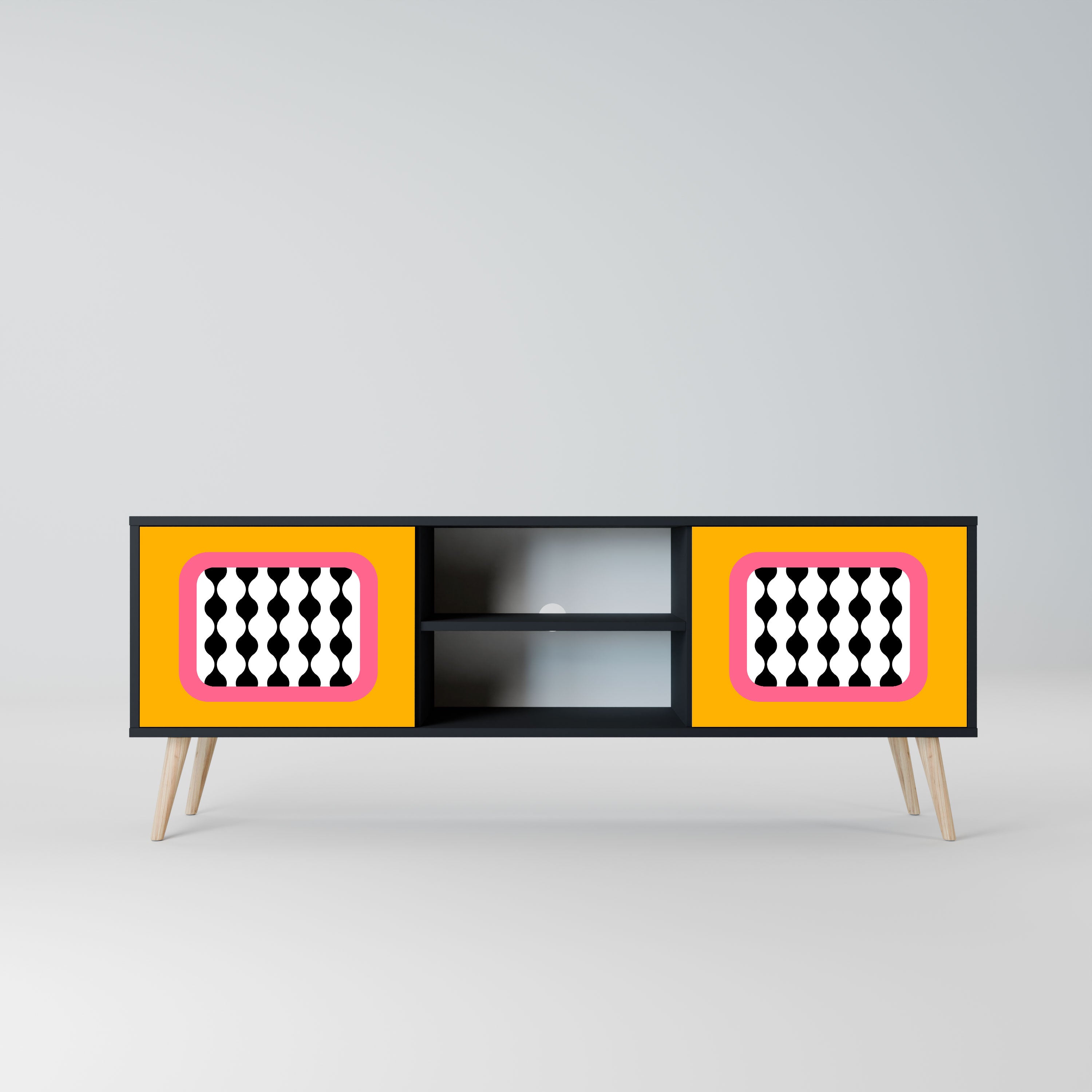 Czarny korpus nadaje szafce eleganckiego, nowoczesnego wyglądu, a fronty z wyjątkowym nadrukiem przyciągają uwagę, czyniąc ją centralnym punktem każdego pomieszczenia. Przestronne wnętrze pomieści sprzęt elektroniczny, kable, piloty i inne akcesoria, pozwalając utrzymać porządek.
