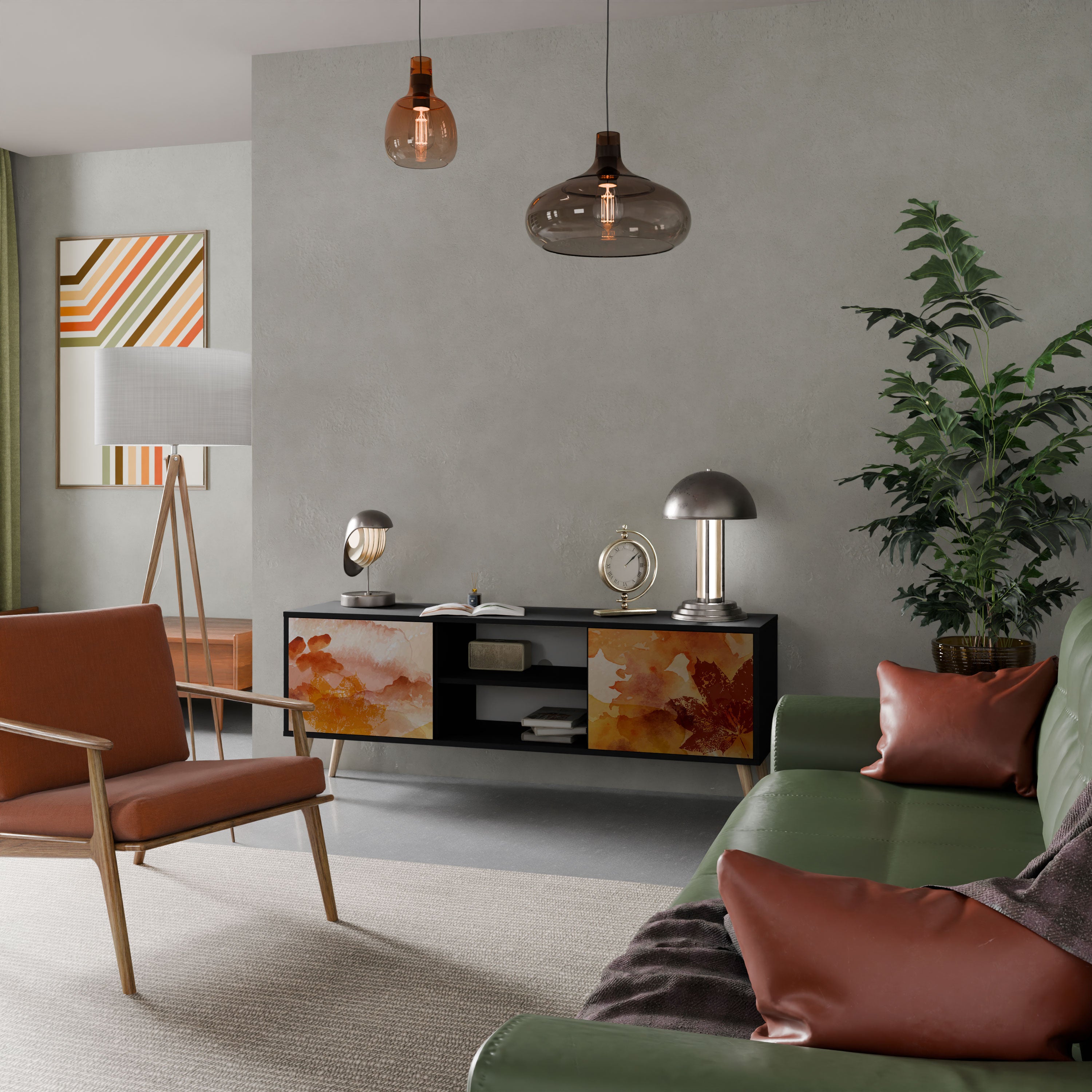 Czarny korpus nadaje szafce eleganckiego, nowoczesnego wyglądu, a fronty z wyjątkowym nadrukiem przyciągają uwagę, czyniąc ją centralnym punktem każdego pomieszczenia. Przestronne wnętrze pomieści sprzęt elektroniczny, kable, piloty i inne akcesoria, pozwalając utrzymać porządek.