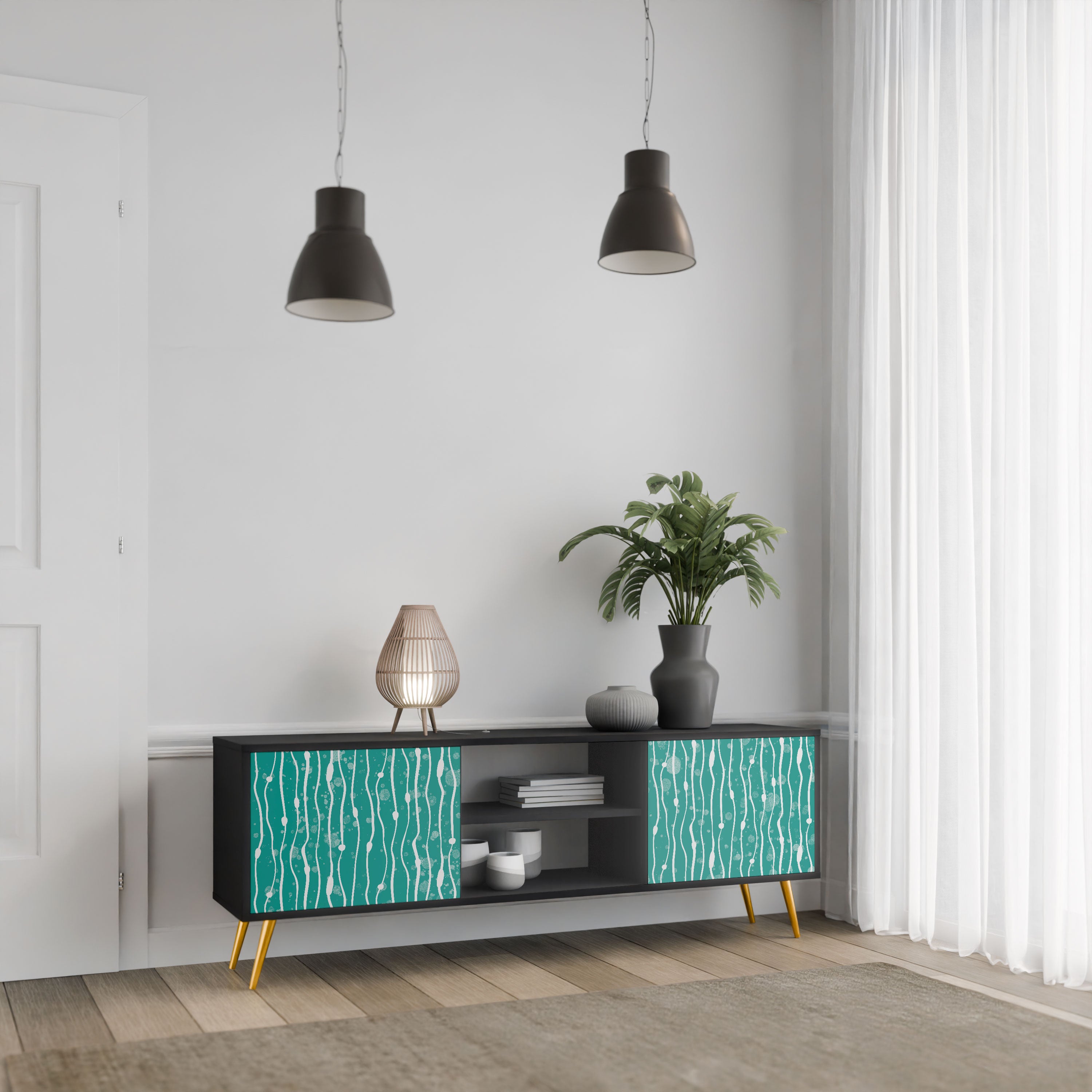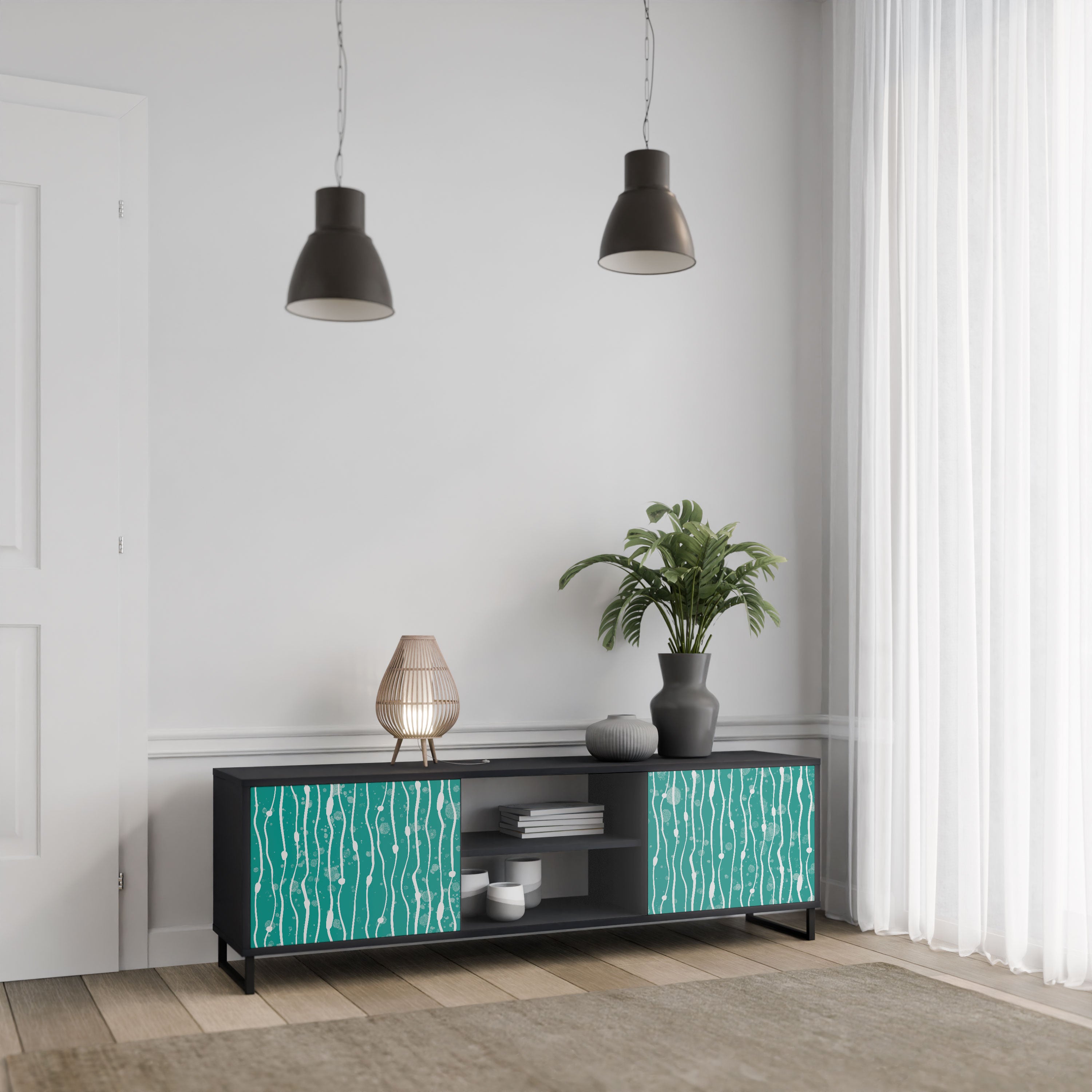 Czarny korpus nadaje szafce eleganckiego, nowoczesnego wyglądu, a fronty z wyjątkowym nadrukiem przyciągają uwagę, czyniąc ją centralnym punktem każdego pomieszczenia. Przestronne wnętrze pomieści sprzęt elektroniczny, kable, piloty i inne akcesoria, pozwalając utrzymać porządek.