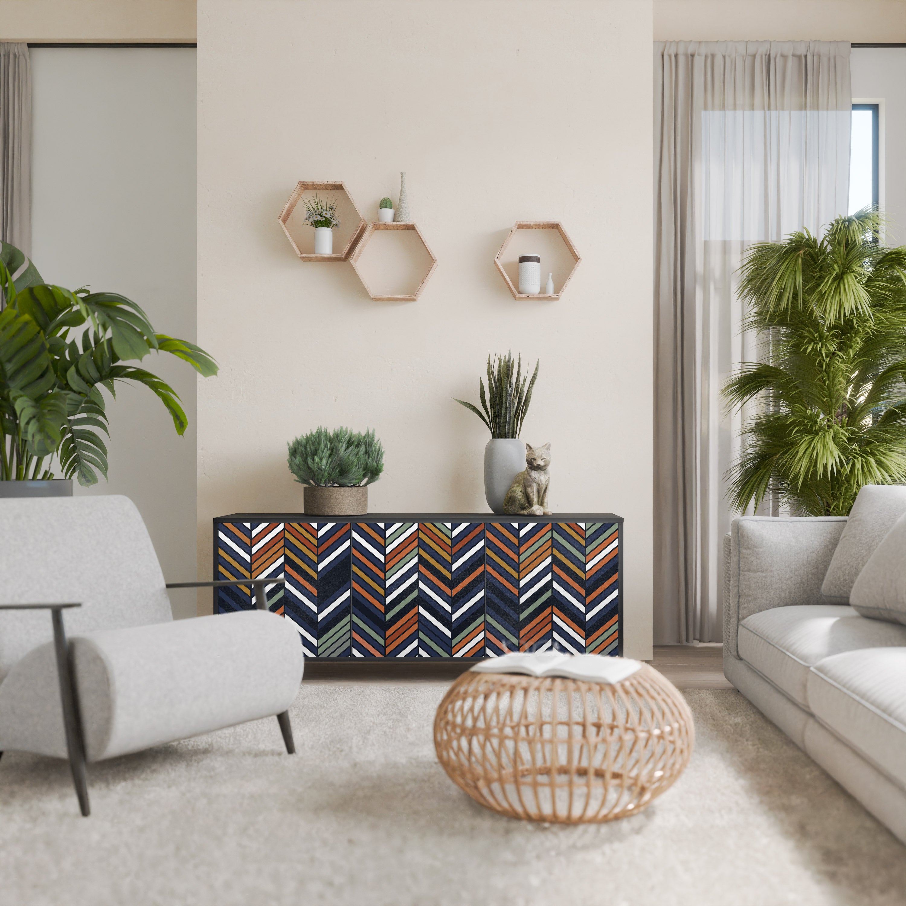 Ten unikalny wzór to połączenie nowoczesnej geometrii z subtelną estetyką science-fiction. Na froncie mebla dominuje czarno-biała mozaika złożona z trójkątów, linii i nieregularnych form, które układają się w hipnotyzującą, rytmiczną kompozycję. Wzór tworzy wrażenie głębi i ruchu – jak pulsujący kod z przyszłości.